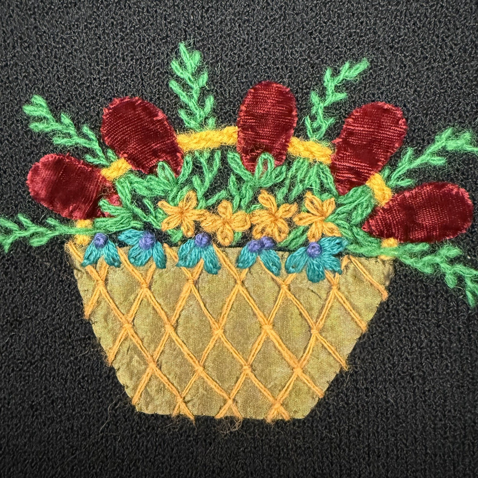 как выглядит Susan Bristol Vintage Black Crewneck Sweater Embroidered Floral Basket Large фото