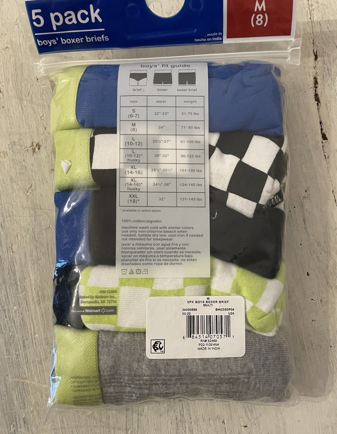 Boys Cotton Boxer Brief Underwear 5-Pack Size Medium 8 Black Checkered Blue