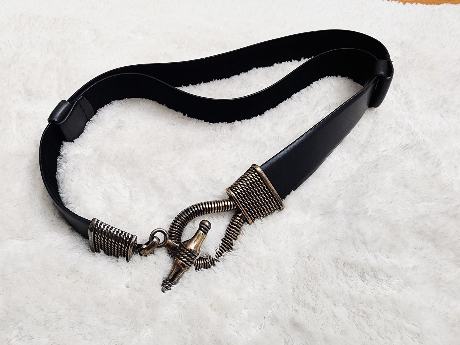 как выглядит Chicos Black Adjustable Leather Belt Silver Horsebit Loop Tribal Buckle ML VTG фото