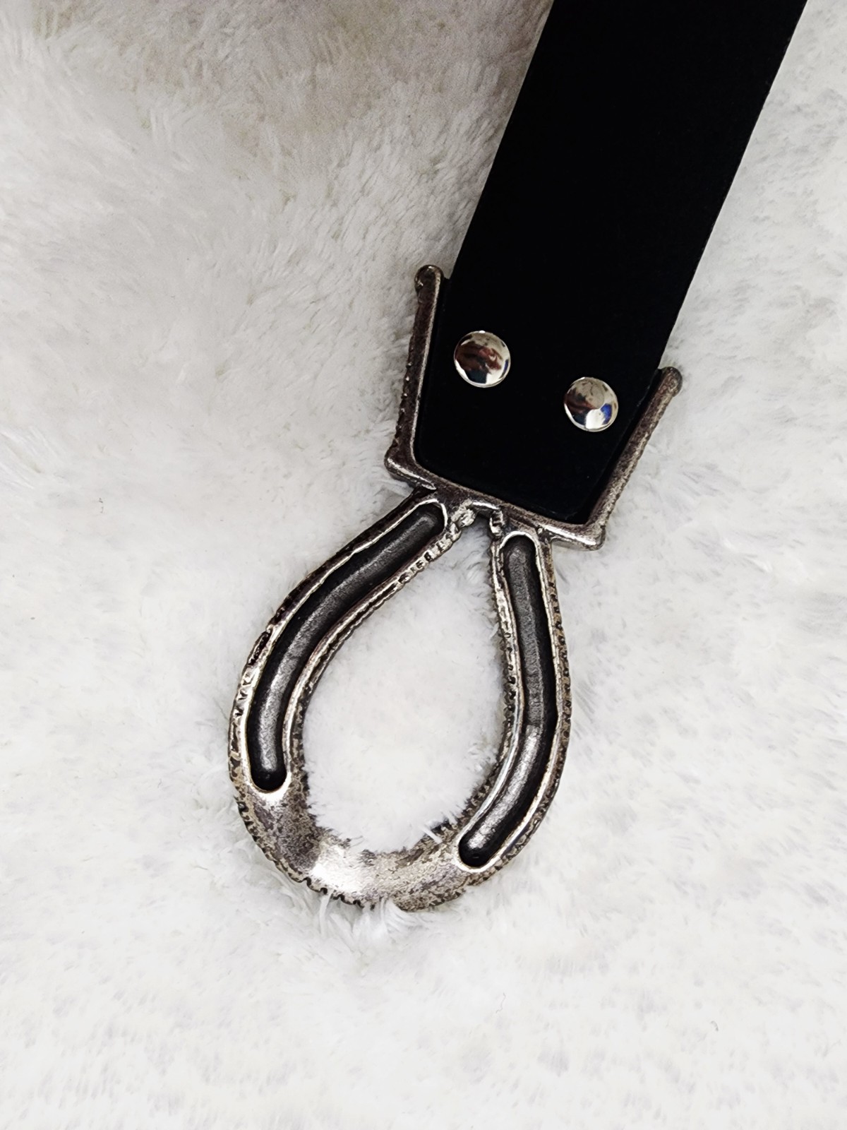 Chicos Black Adjustable Leather Belt Silver Horsebit Loop Tribal Buckle ML VTG
