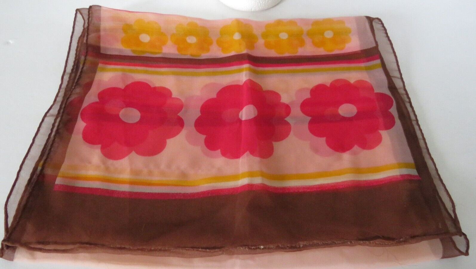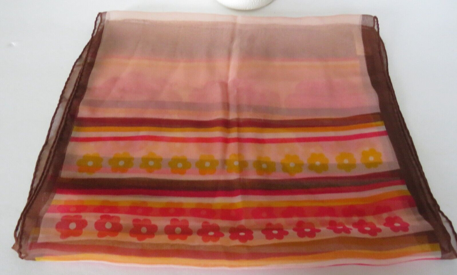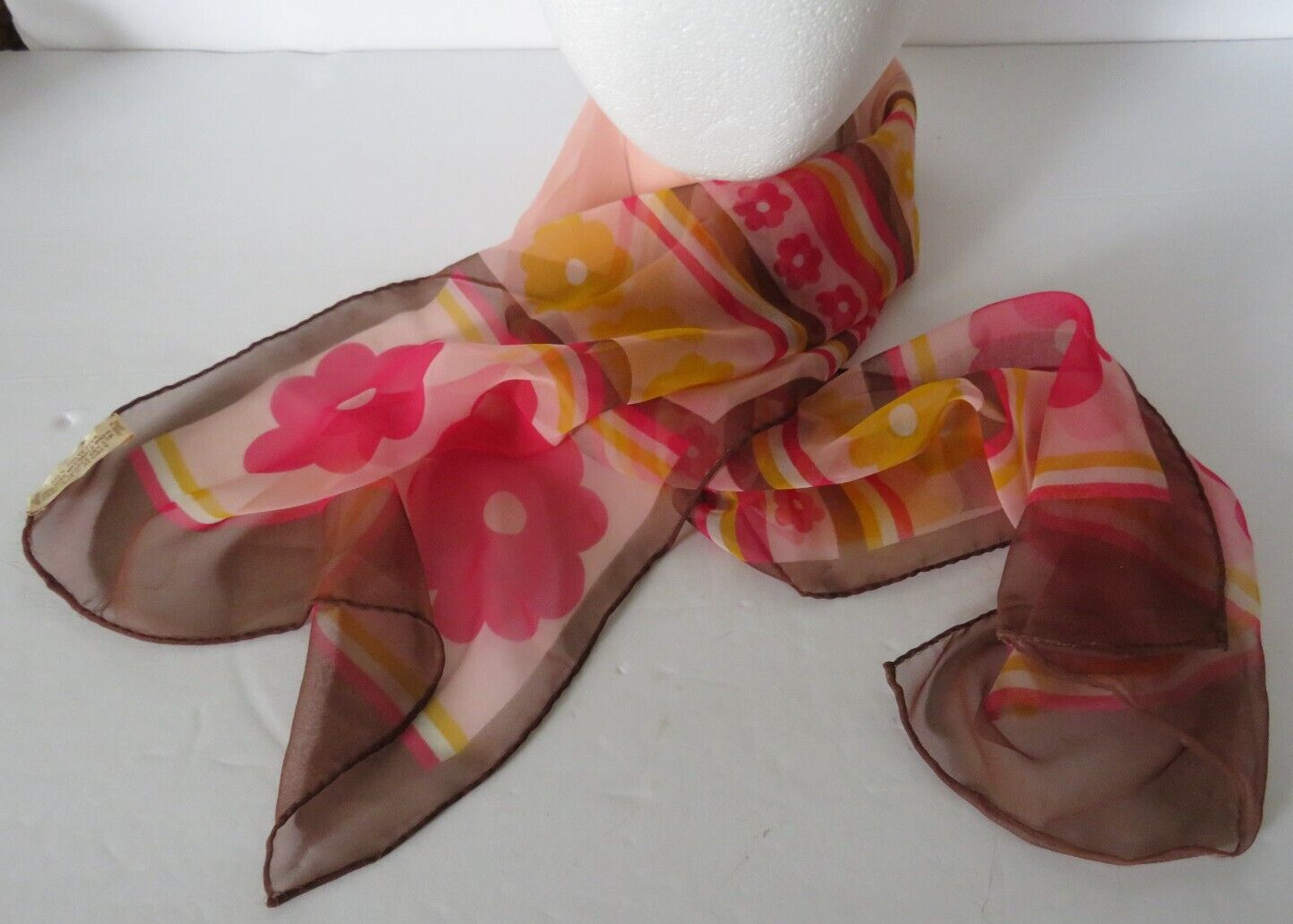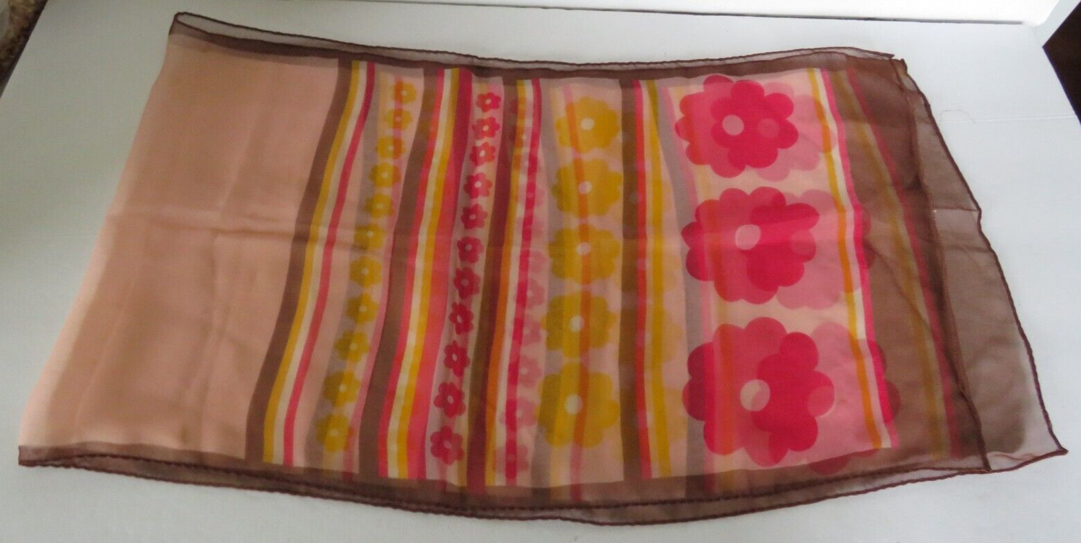 как выглядит Vintage Lady Heritage Scarf Dark Pink Brown Flowers Stripes Sheer 13"x44" Retro фото
