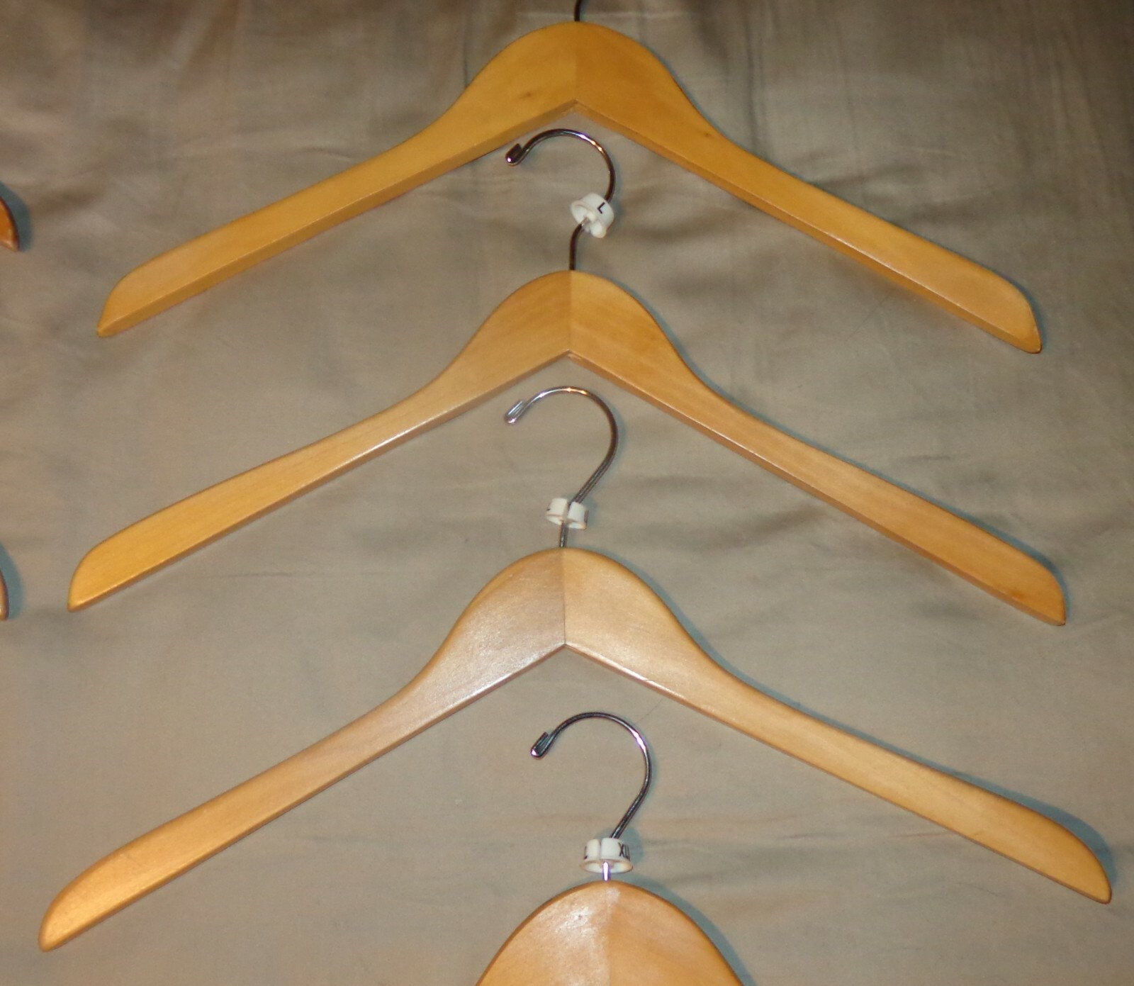 как выглядит 10 VINTAGE WOOD ADULT SIZED COAT JACKET SHIRT HANGERS SWIVEL HOOKS SIZERS фото