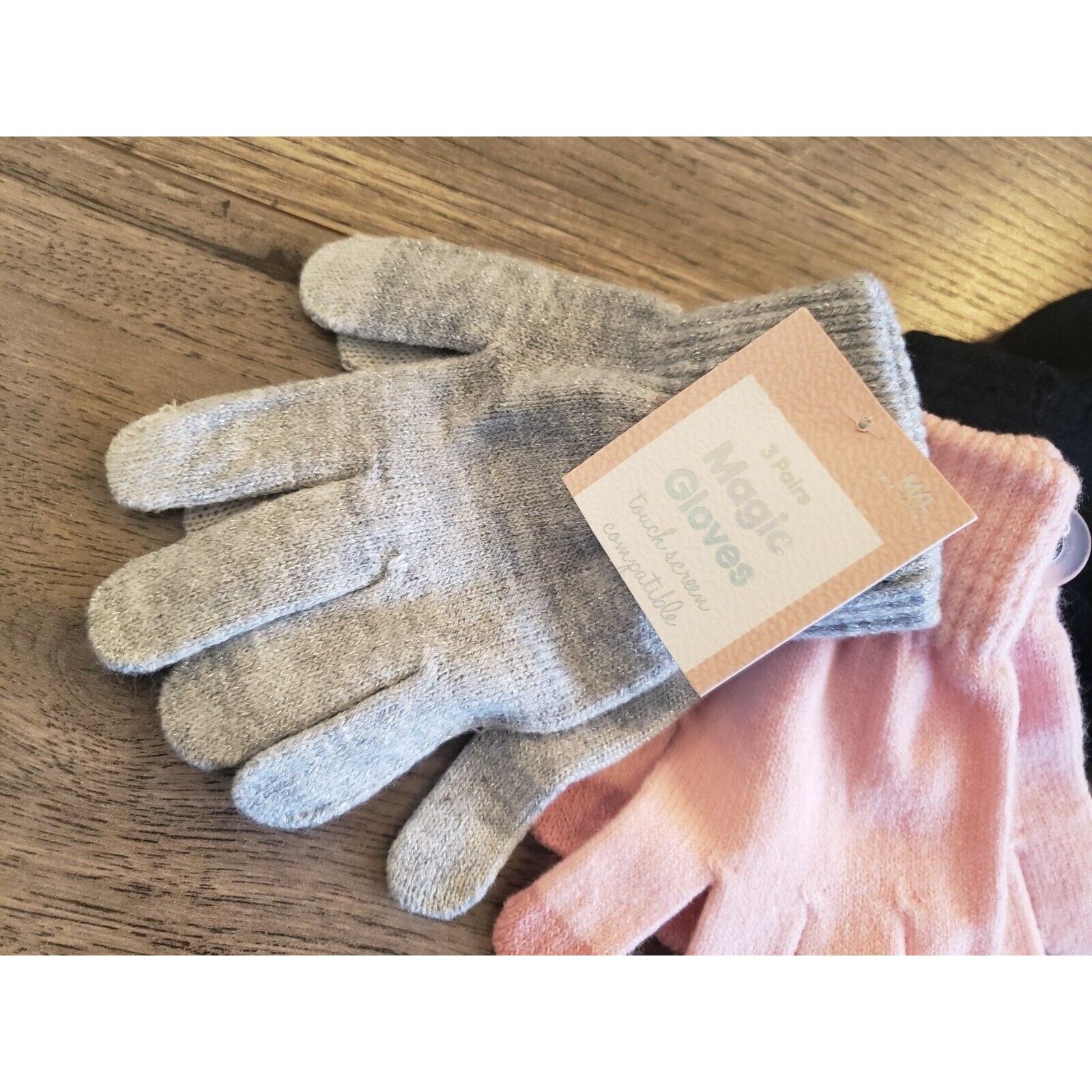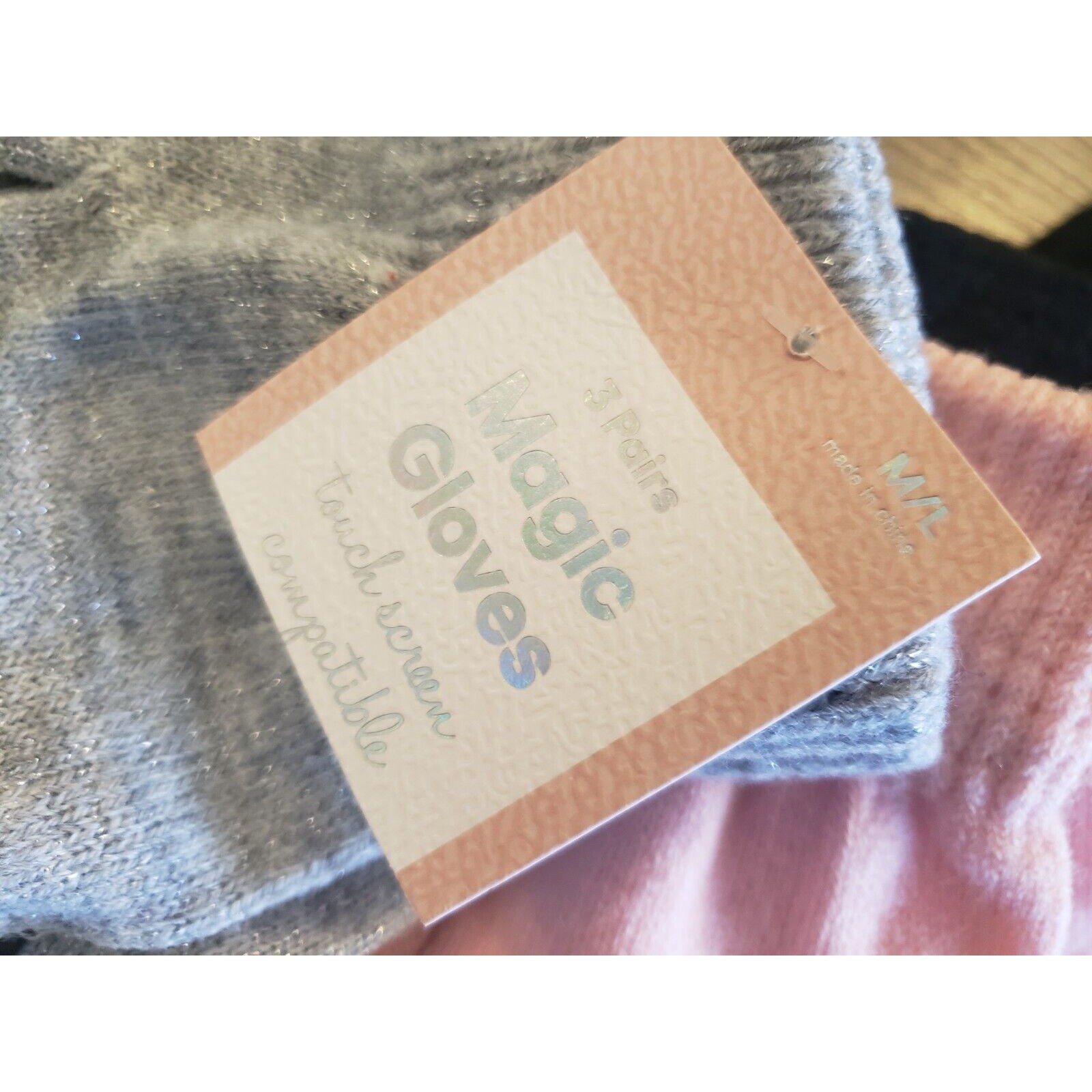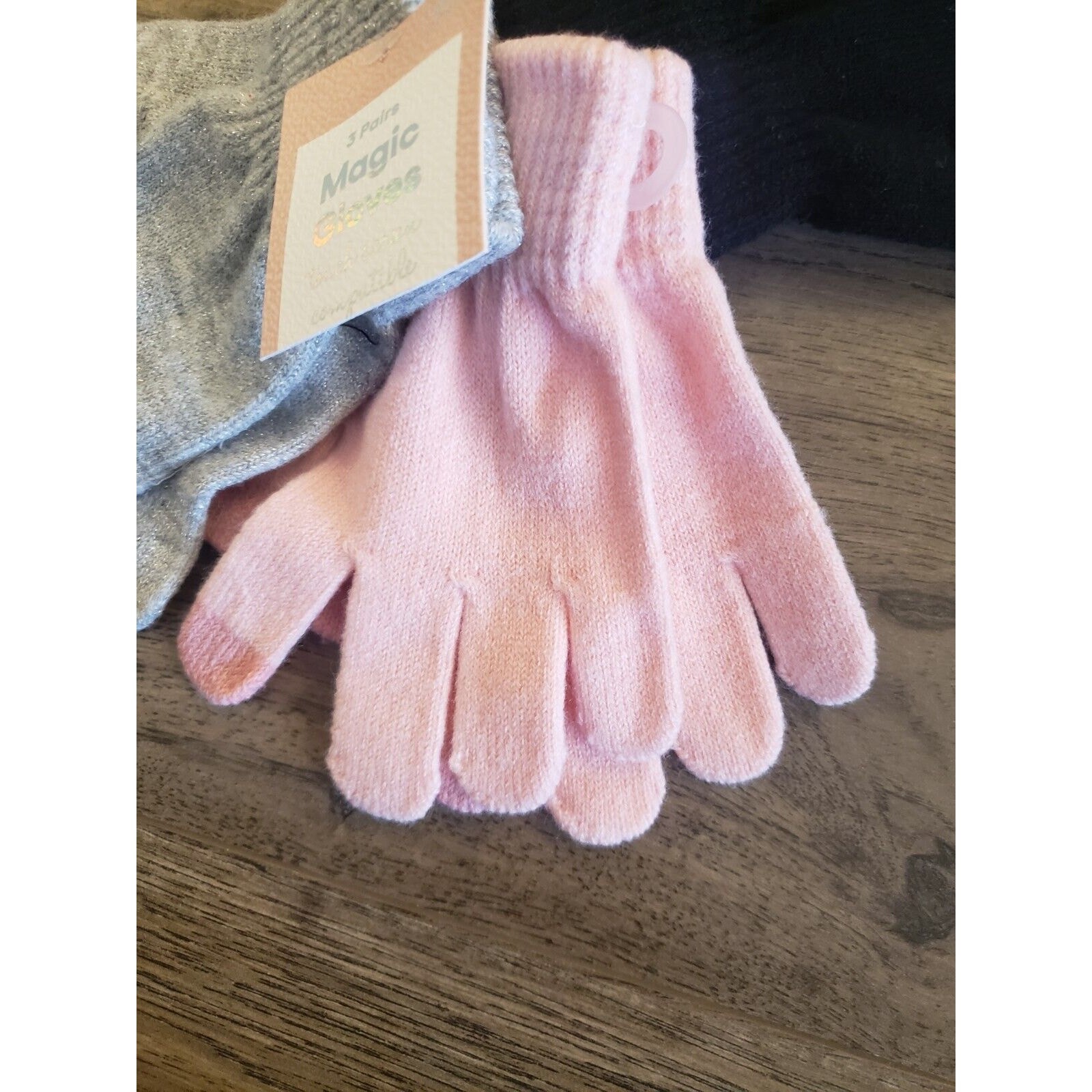 Girls Gloves Set of 3 Solid Pink Black Grey Metallic Threading Kids M/L Winter
