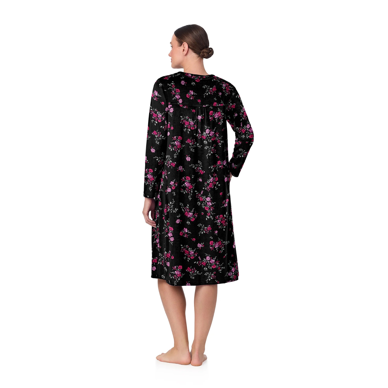 как выглядит Aria Womens Sleepwear Nightgown Long Sleeve Velour Black Floral Pockets 44" New фото
