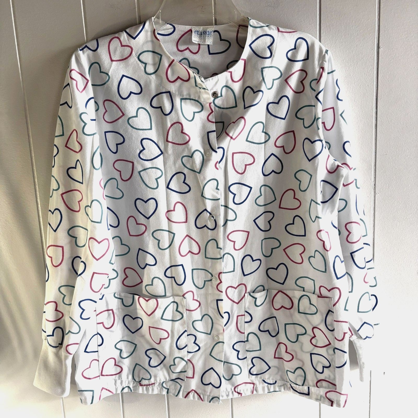 Classic Uniform Women s Small White Heart Print Snap Front Long Sleeve Scrub Top