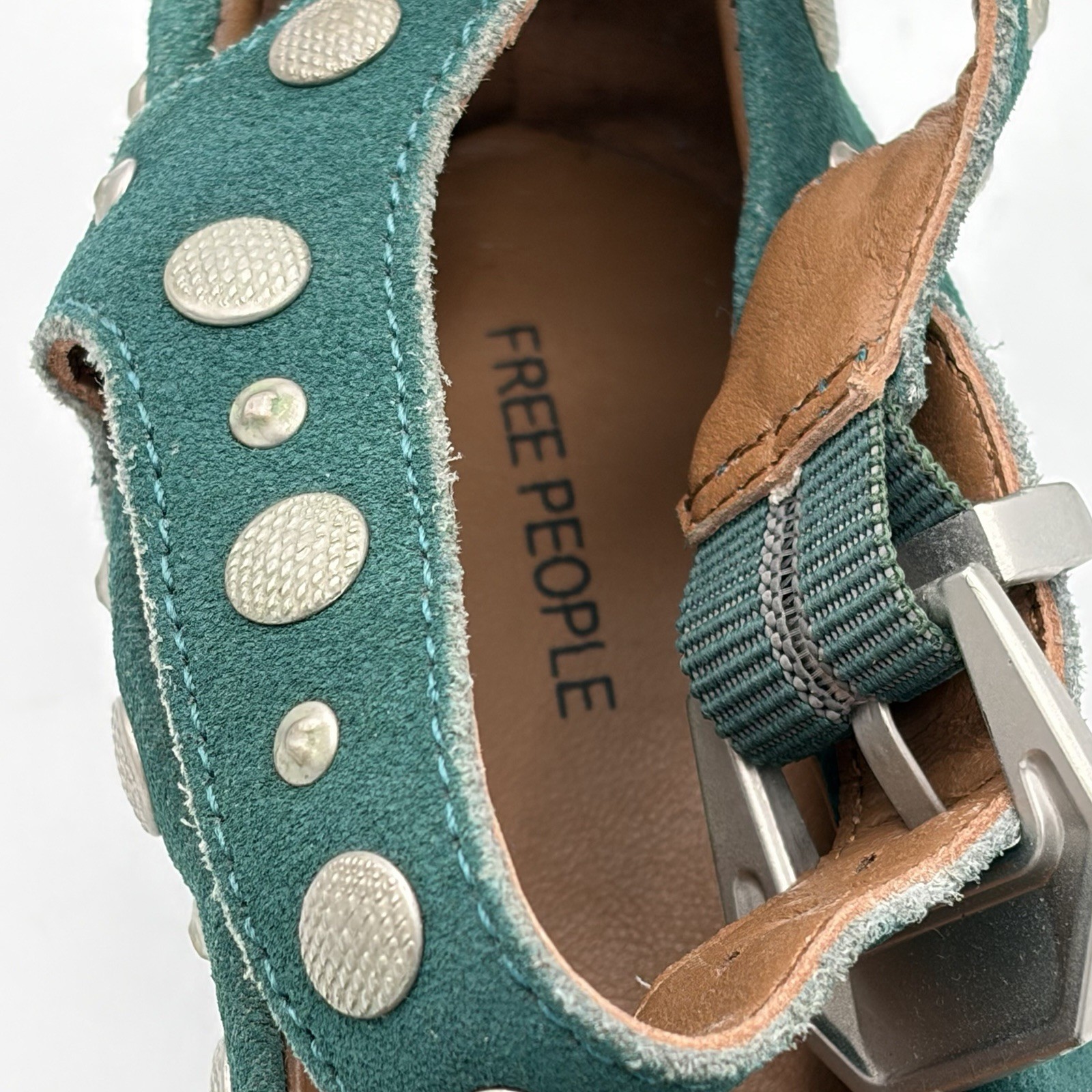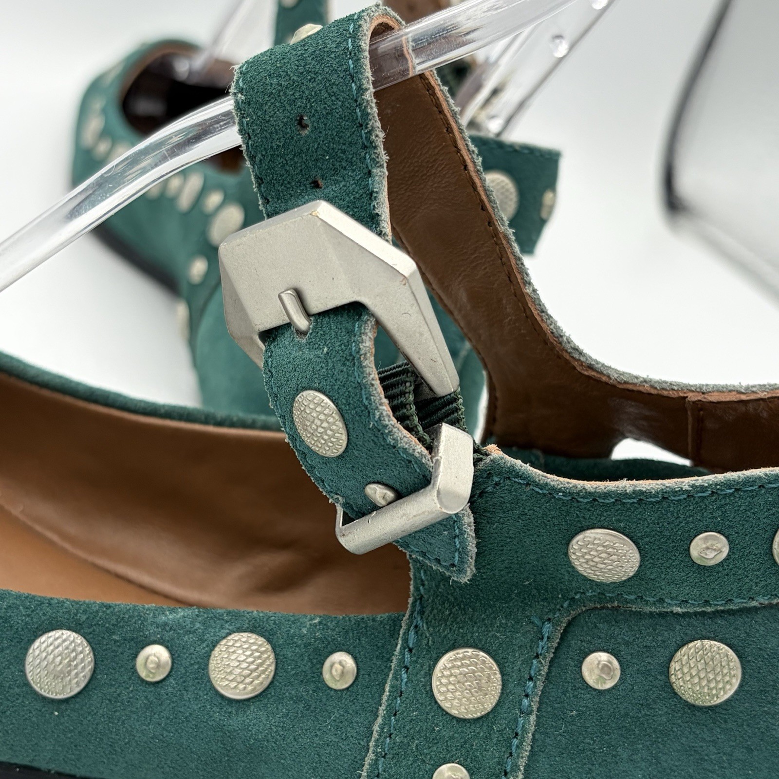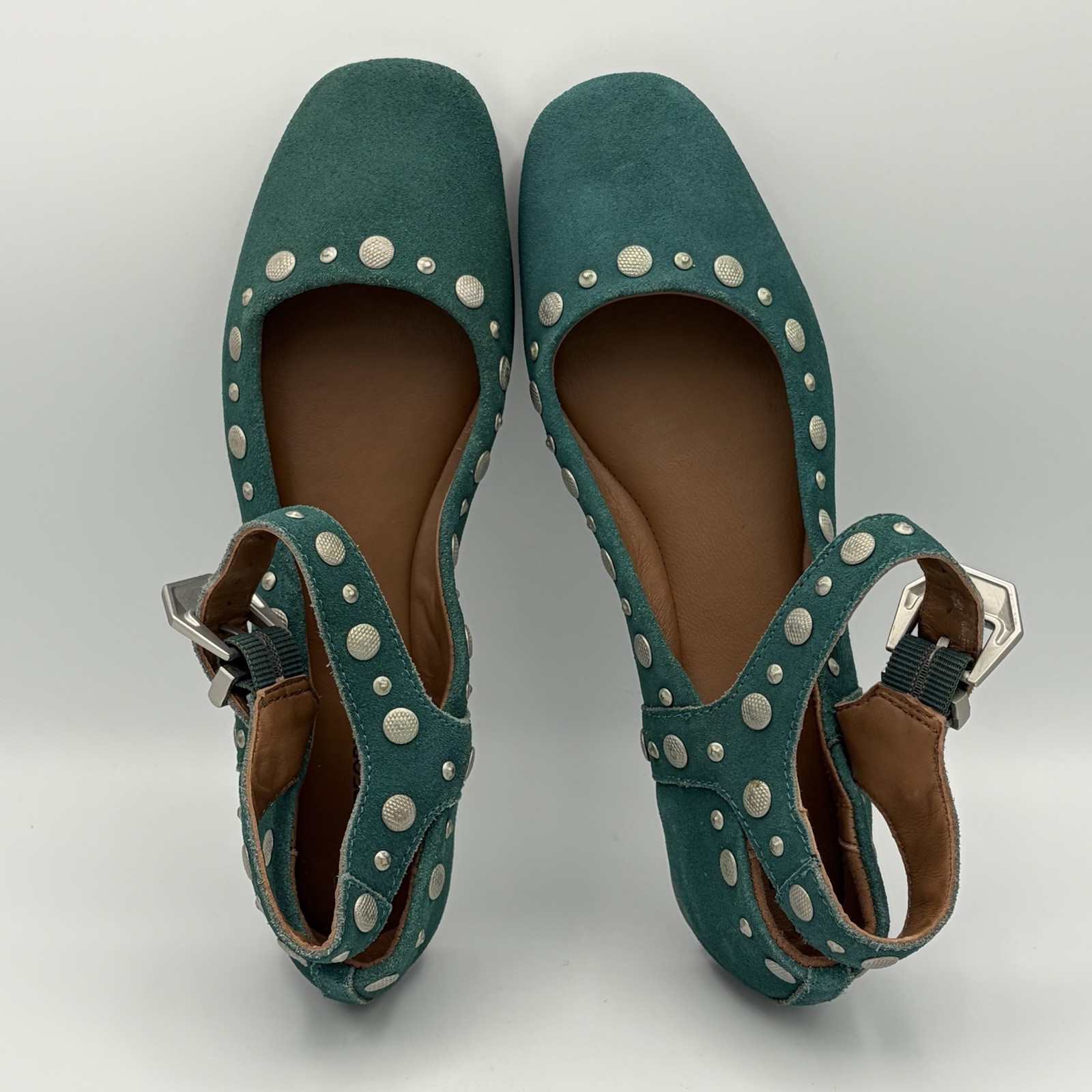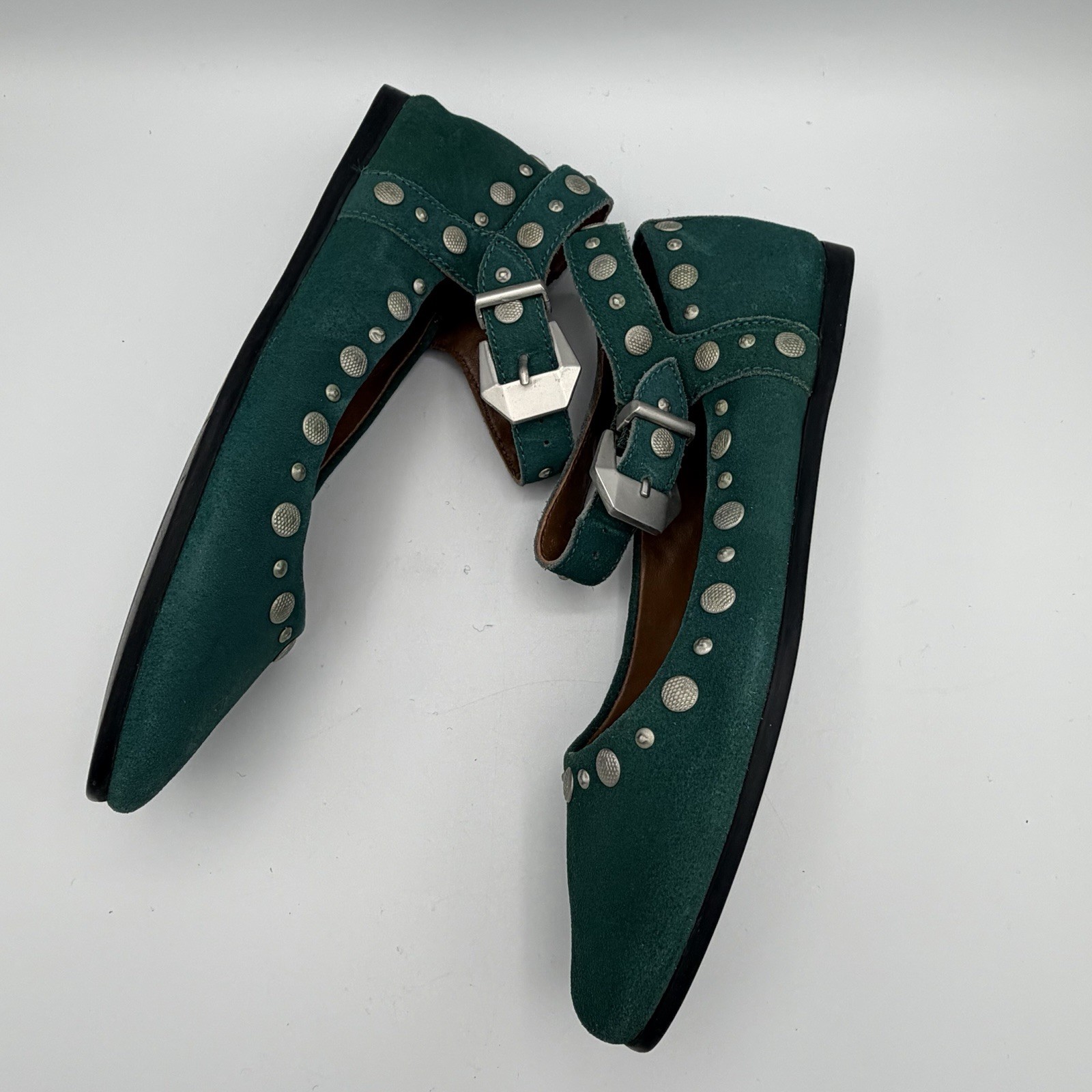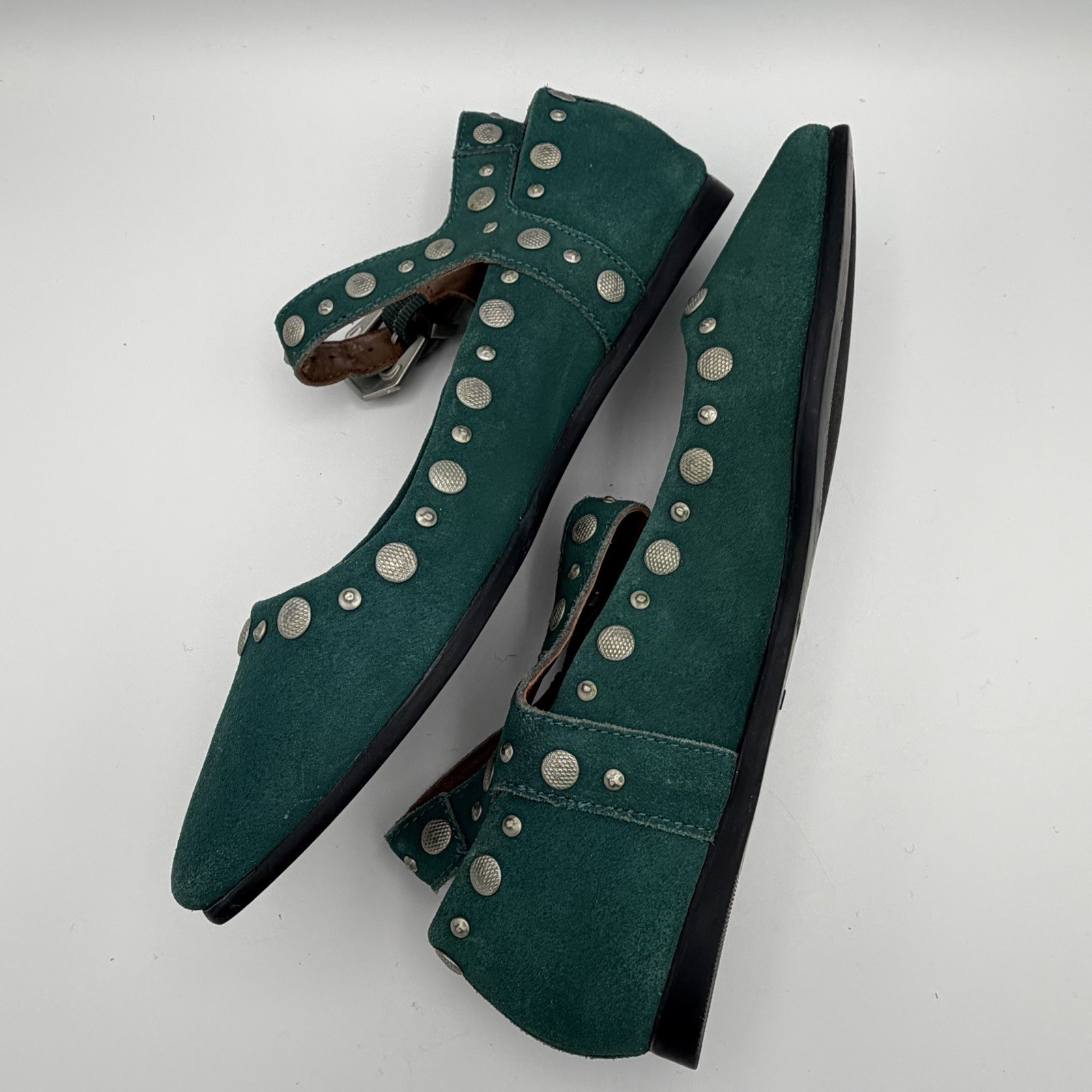 как выглядит Free People Mystic Mary Jane Flats Green Suede Silver Tone Studs Size 6 фото