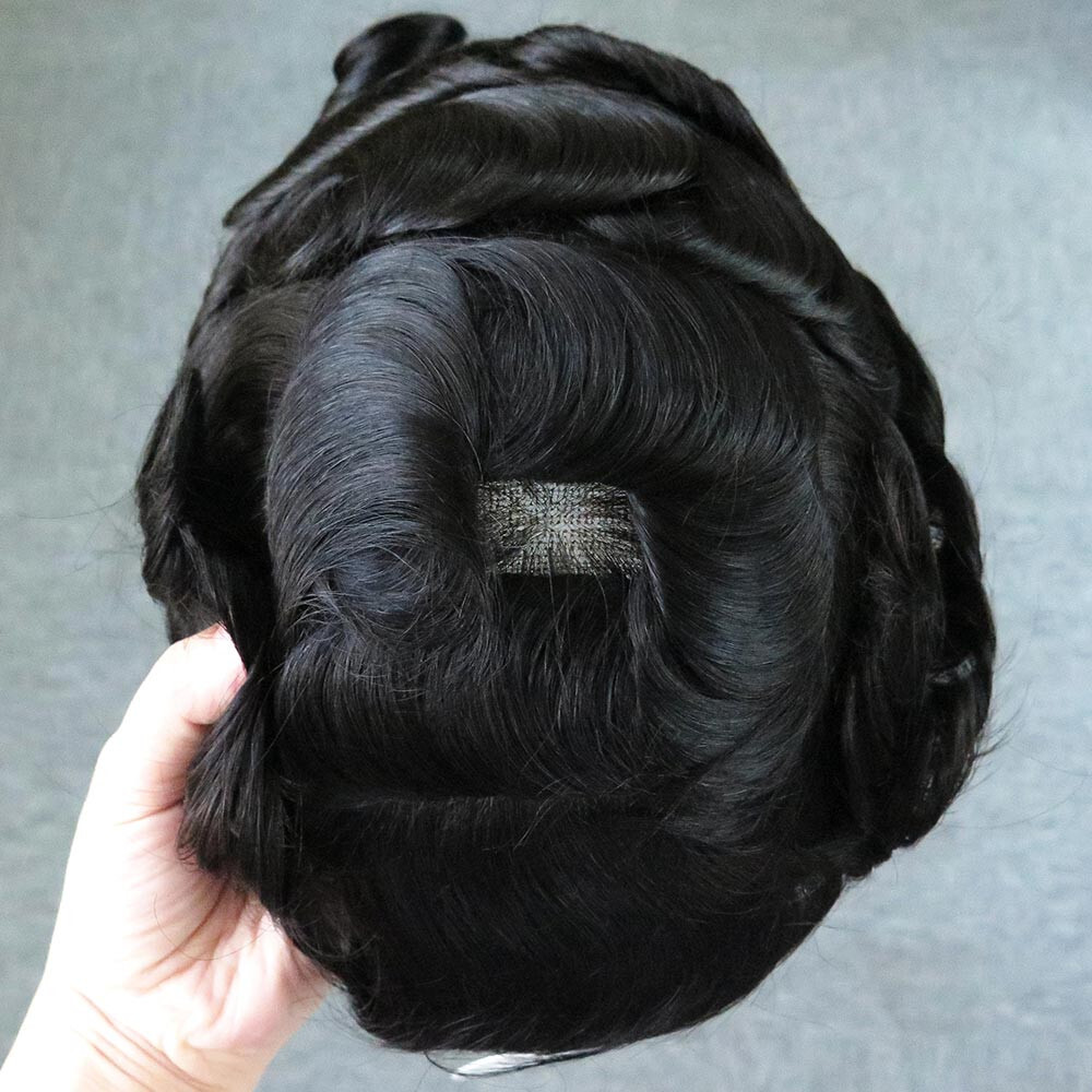 Mens Toupee Human Hair Replacement System French Lace Natural Black Hairpiece 1C