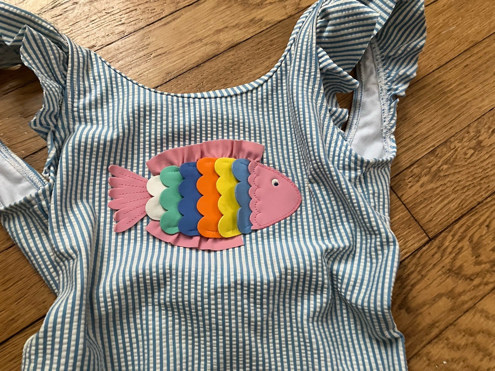 Mini Boden Girls 7/8 Swimsuit Blue Seer Sucker Pinstripe Ruffle Shoulder Fish