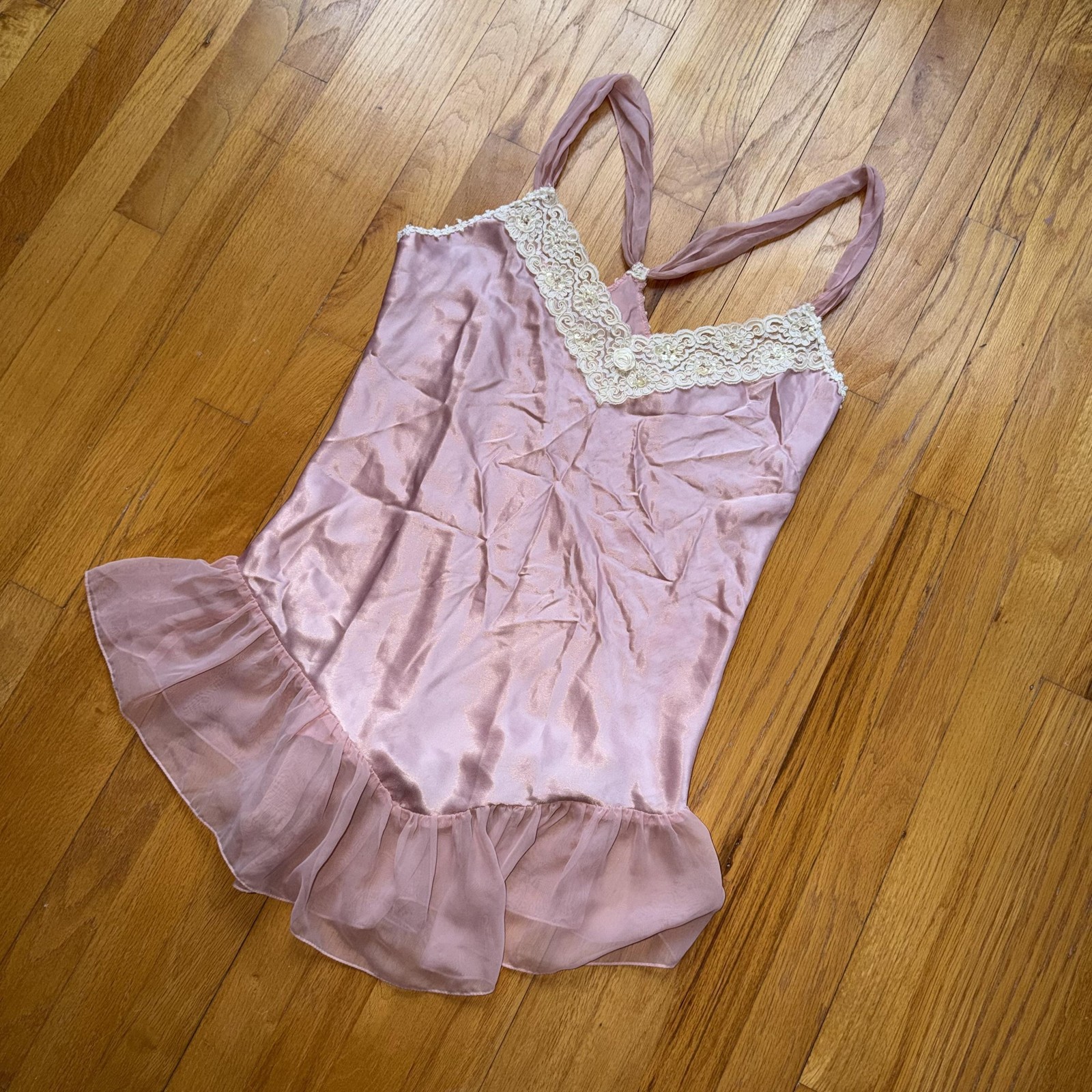 Vintage Dentelle Slip Dress L Pink Satin Lace Ruffle Hem Chemise USA Lingerie
