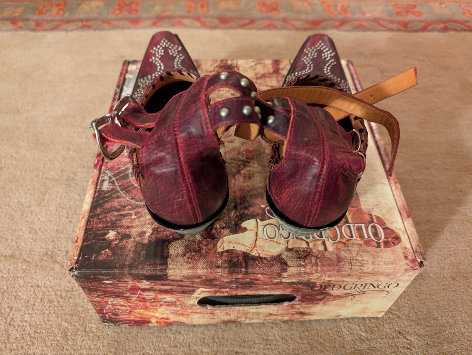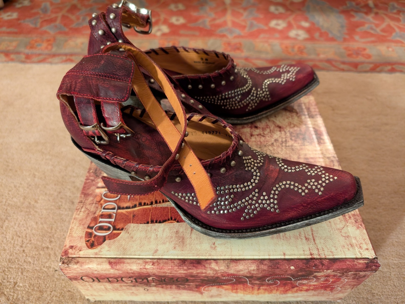 как выглядит NEW Old Gringo Red Evangelina Shoes - Studded Strappy Western Heels - Size 9 фото