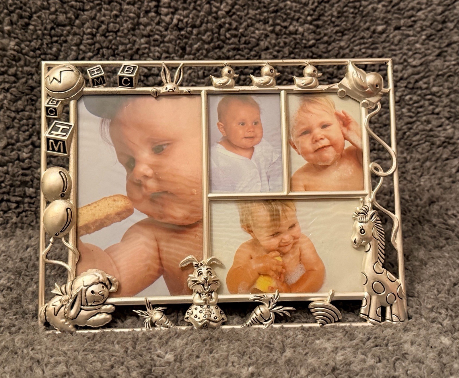 PHOTO FRAME Silver-Tone Metal Baby Nursery Theme Collage Tabletop 4 Photos
