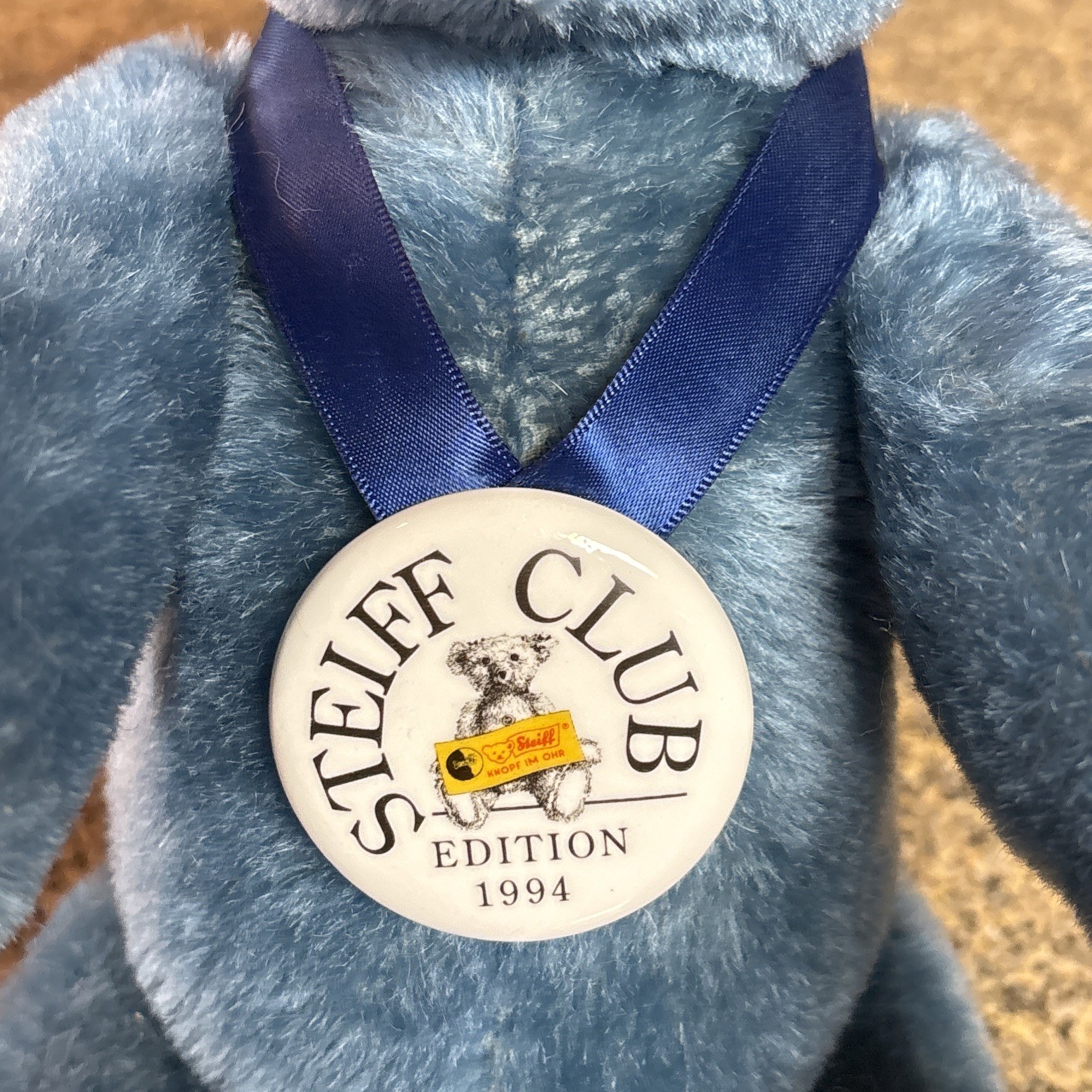как выглядит 1994 STEIFF Club Teddy Bear Blue Mohair 1908 Replica 420047 Button Tags Growler фото