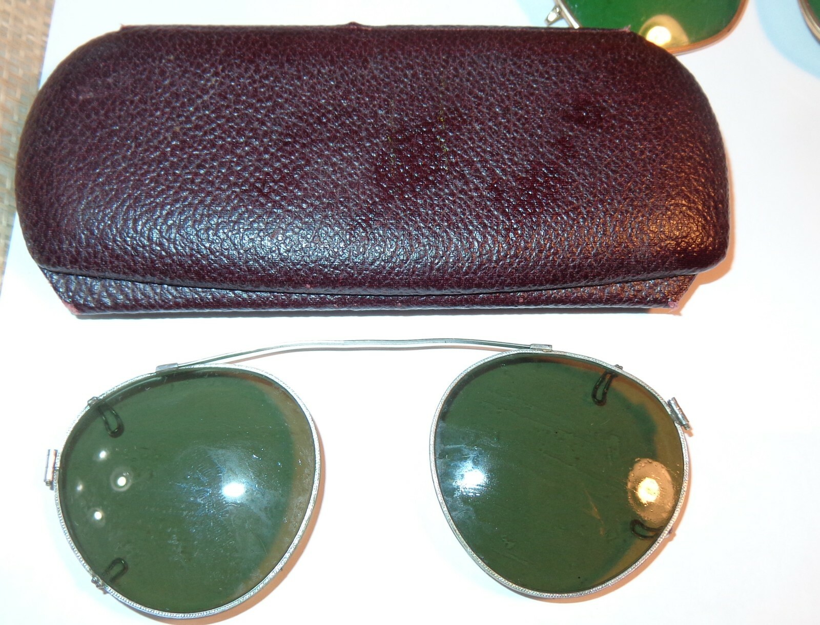 как выглядит 2 VINTAGE ANTIQUE WIRE FRAME CLIP ON GREEN SUNGLASSES CASES FOR OLD EYEGLASSES фото