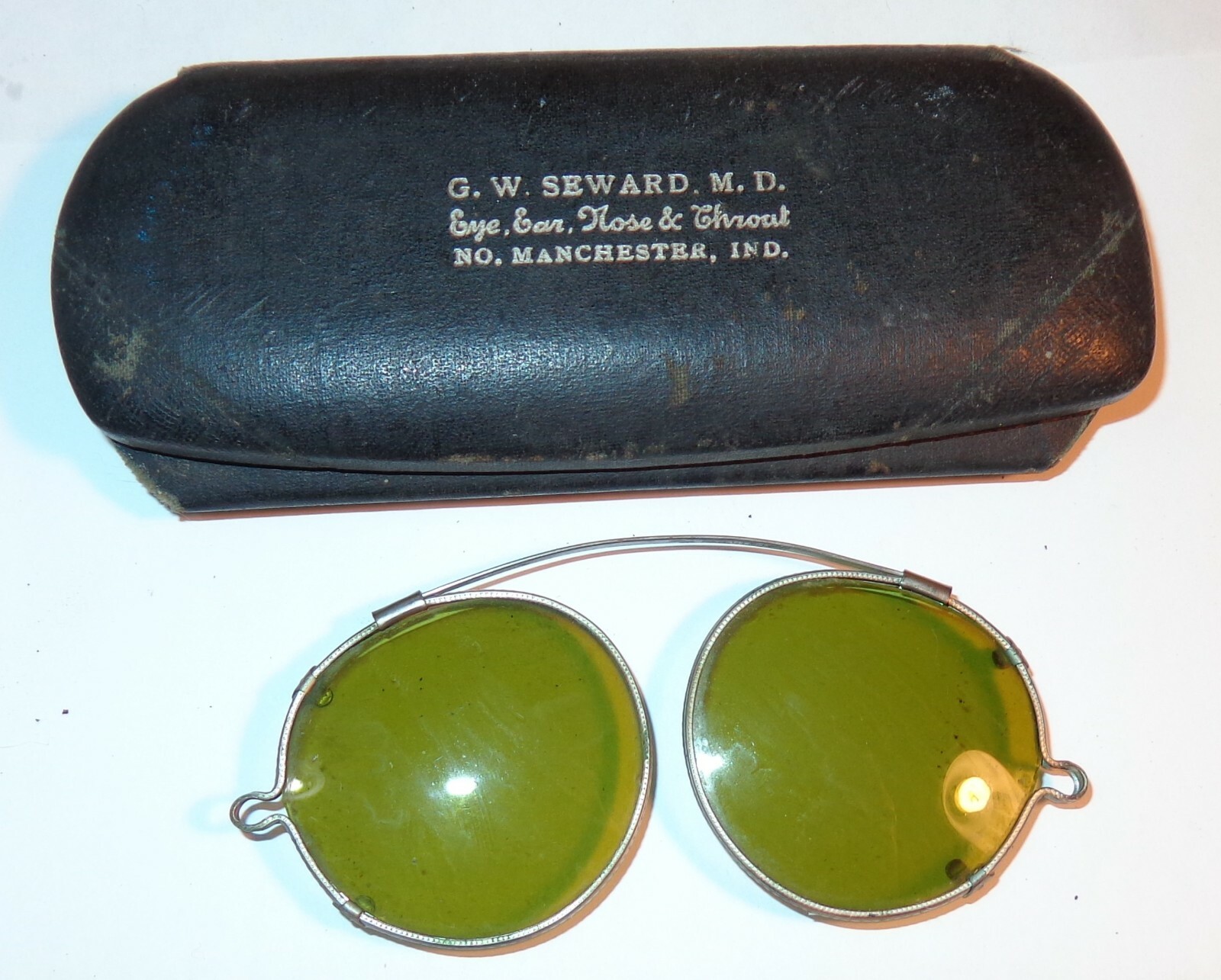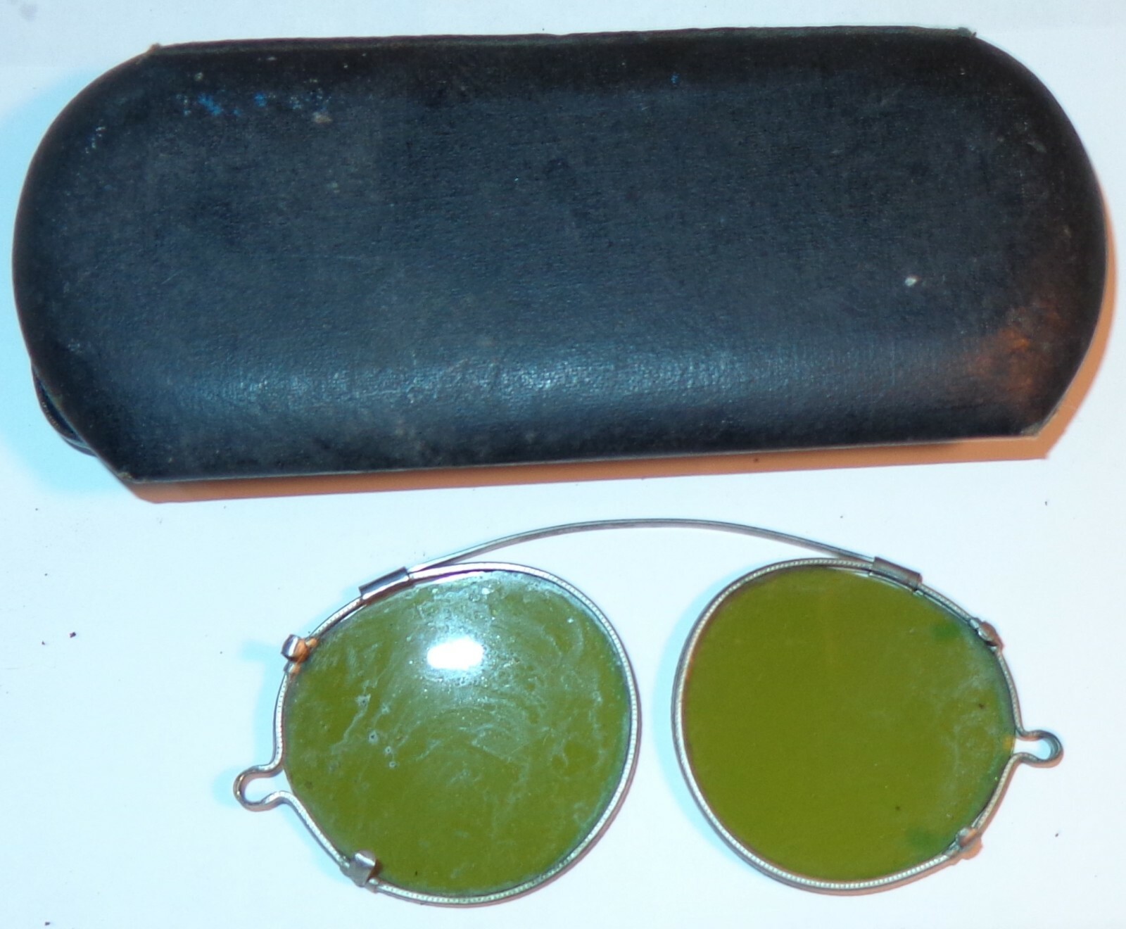 • 2 VINTAGE ANTIQUE WIRE FRAME CLIP ON GREEN SUNGLASSES CASES FOR OLD EYEGLASSES