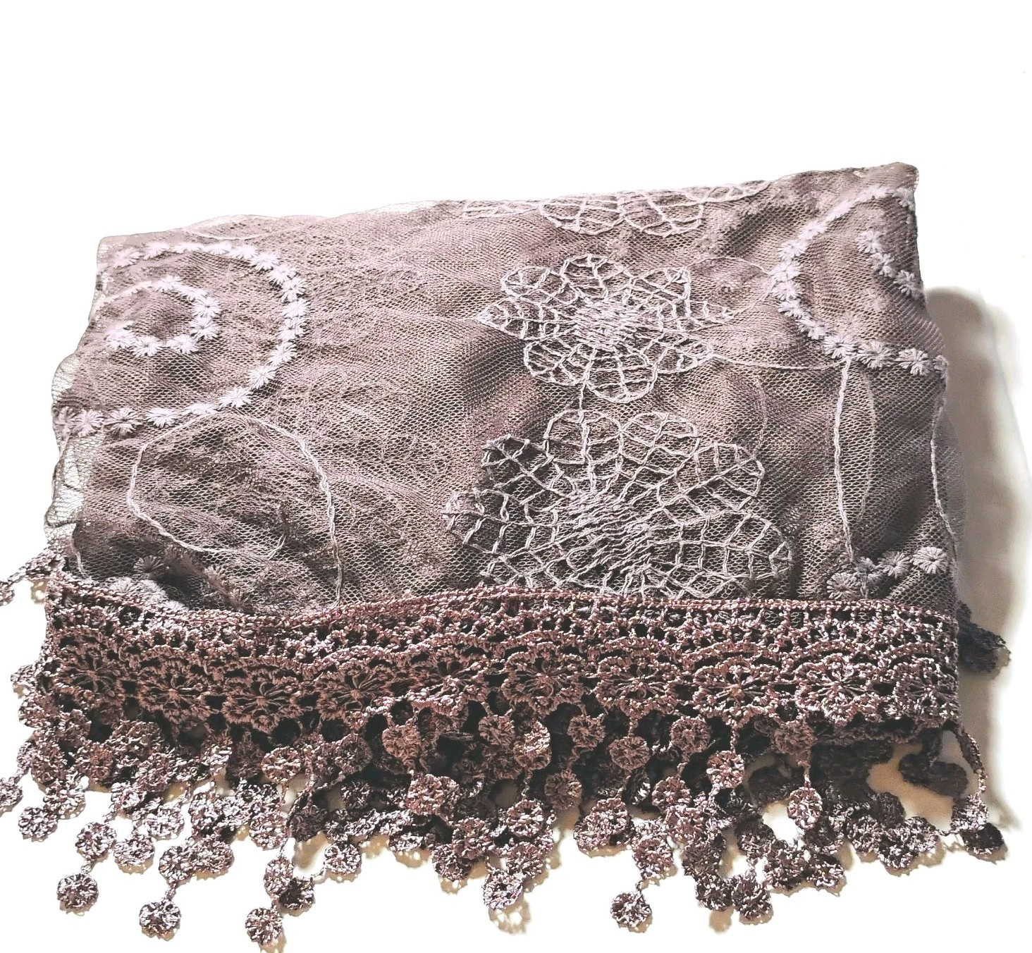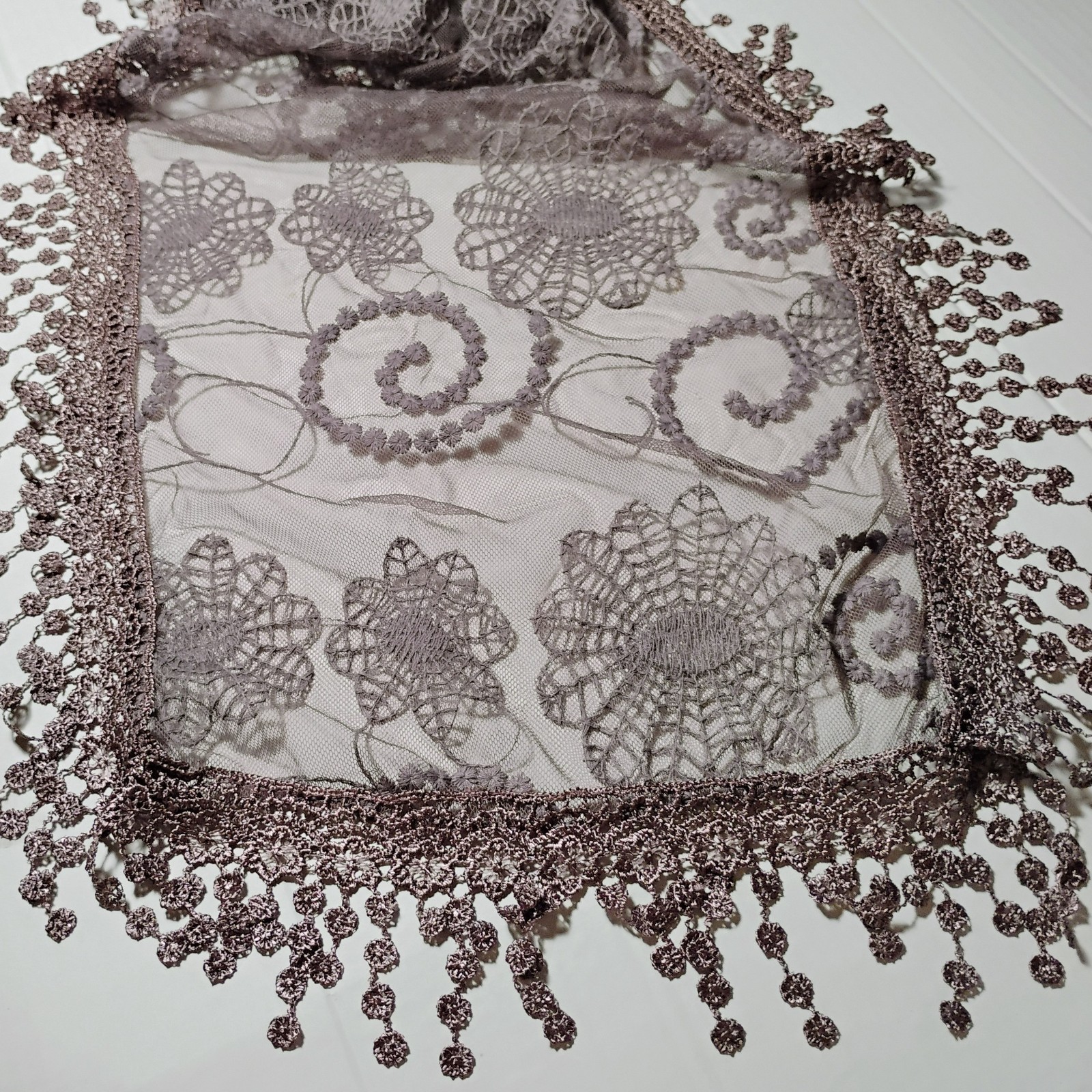 Vintage Crochet Lace Scarf Gray Embroidered Mesh Romantic Boho Wrap 14.5 x 33