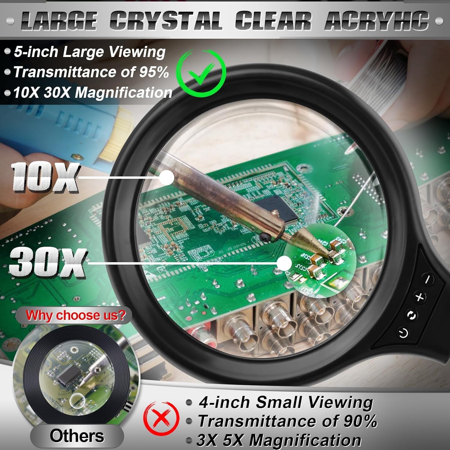 10X 30X Large Magnifying Glass with Light and Stand, 5-inch LED Lighted Magnifie