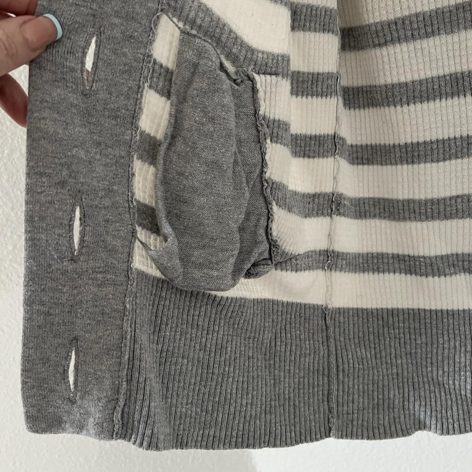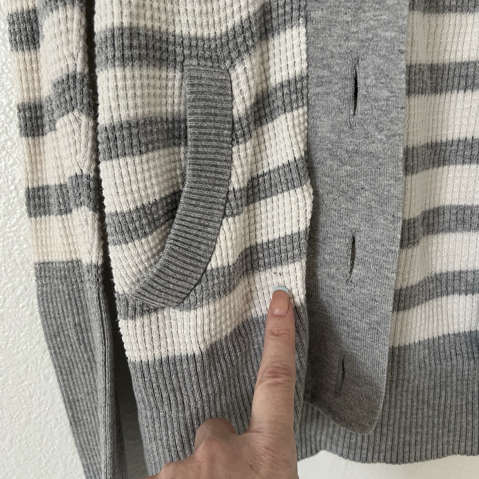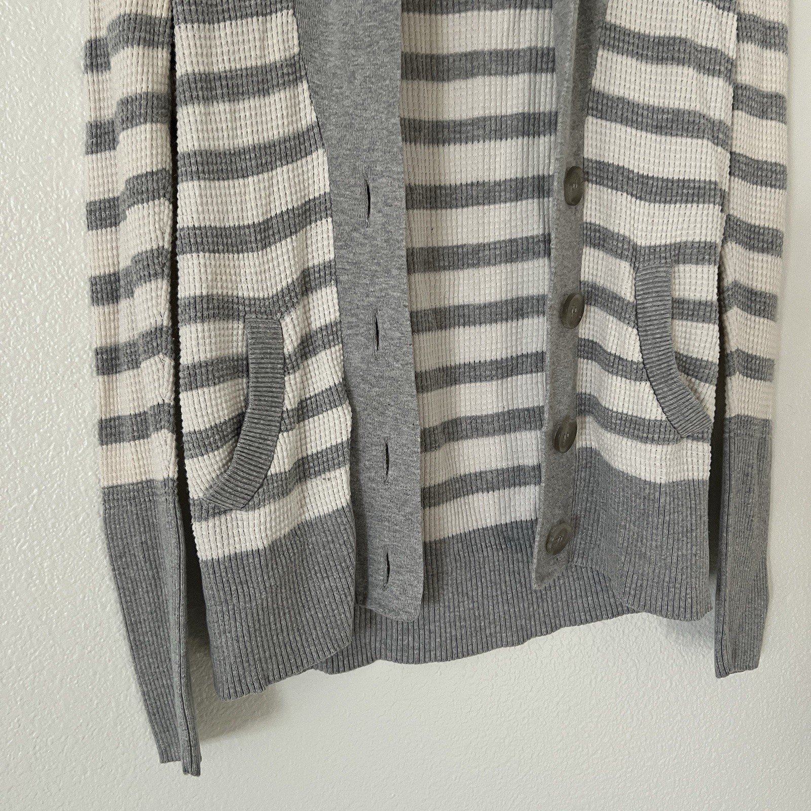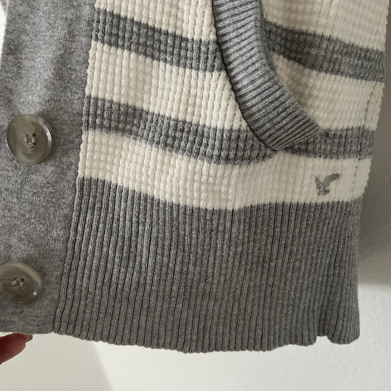 как выглядит American Eagle Medium Cardigan Sweater Gray Striped Y2K Shawl Neck Buttons фото