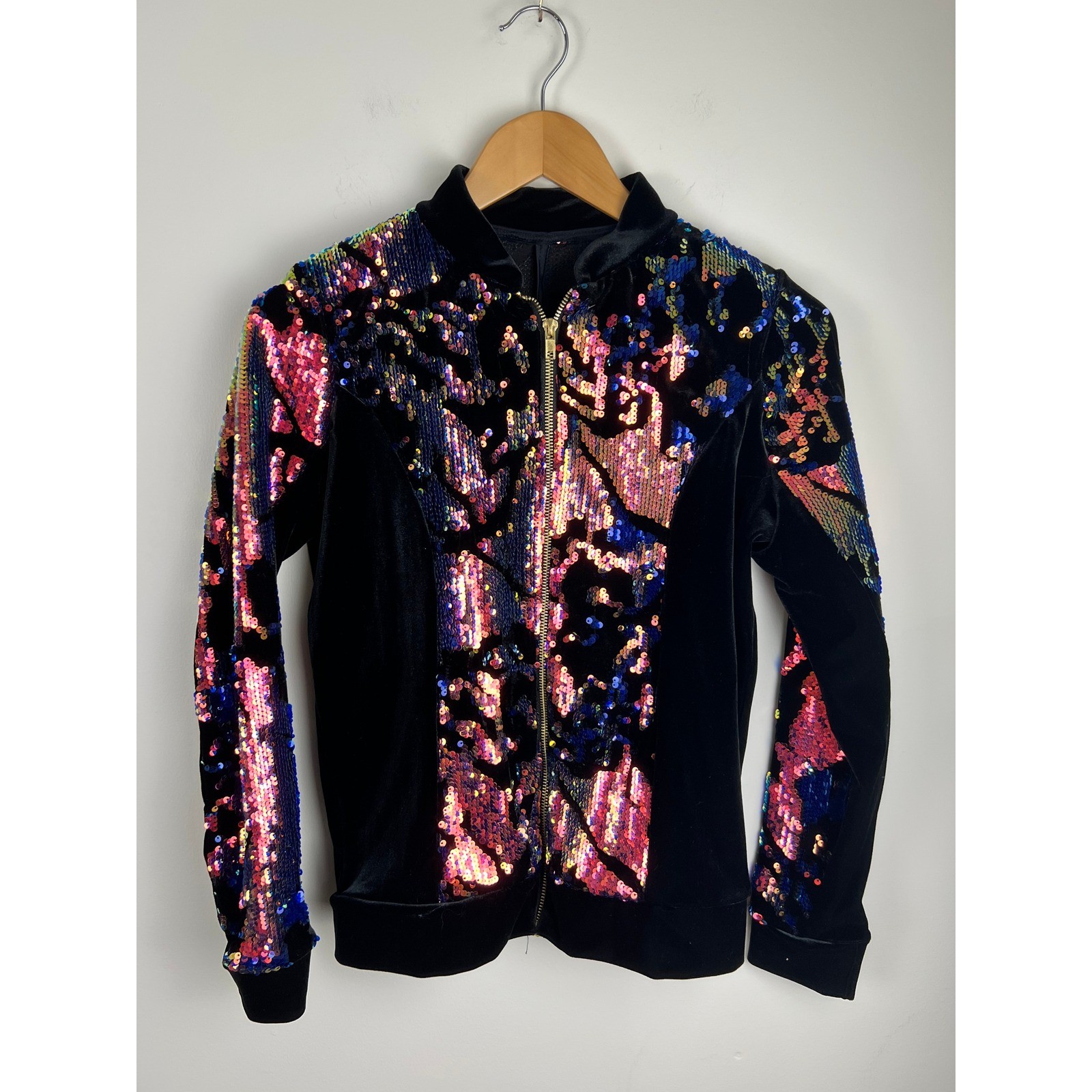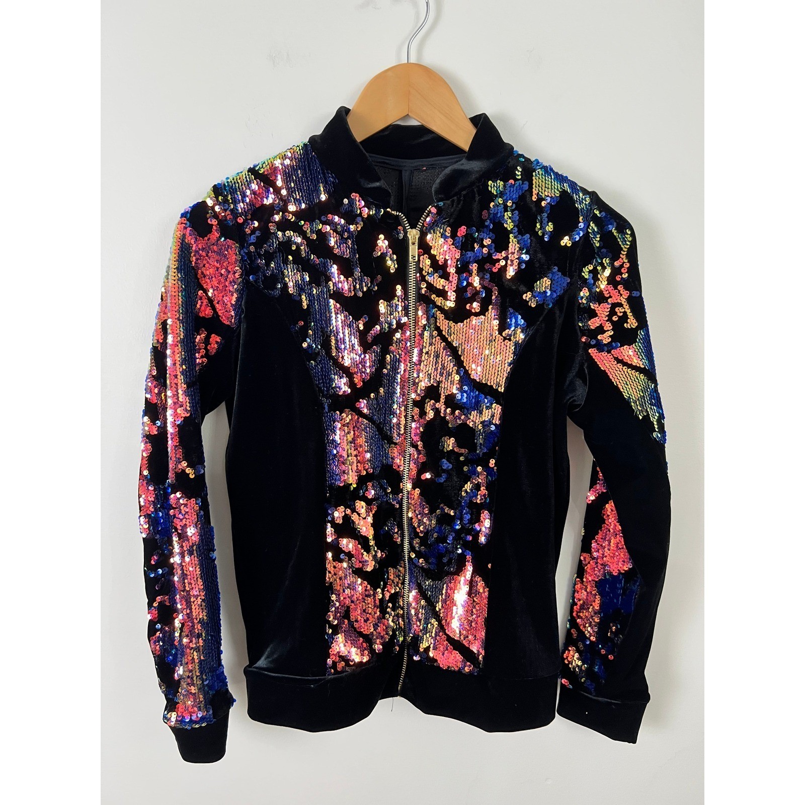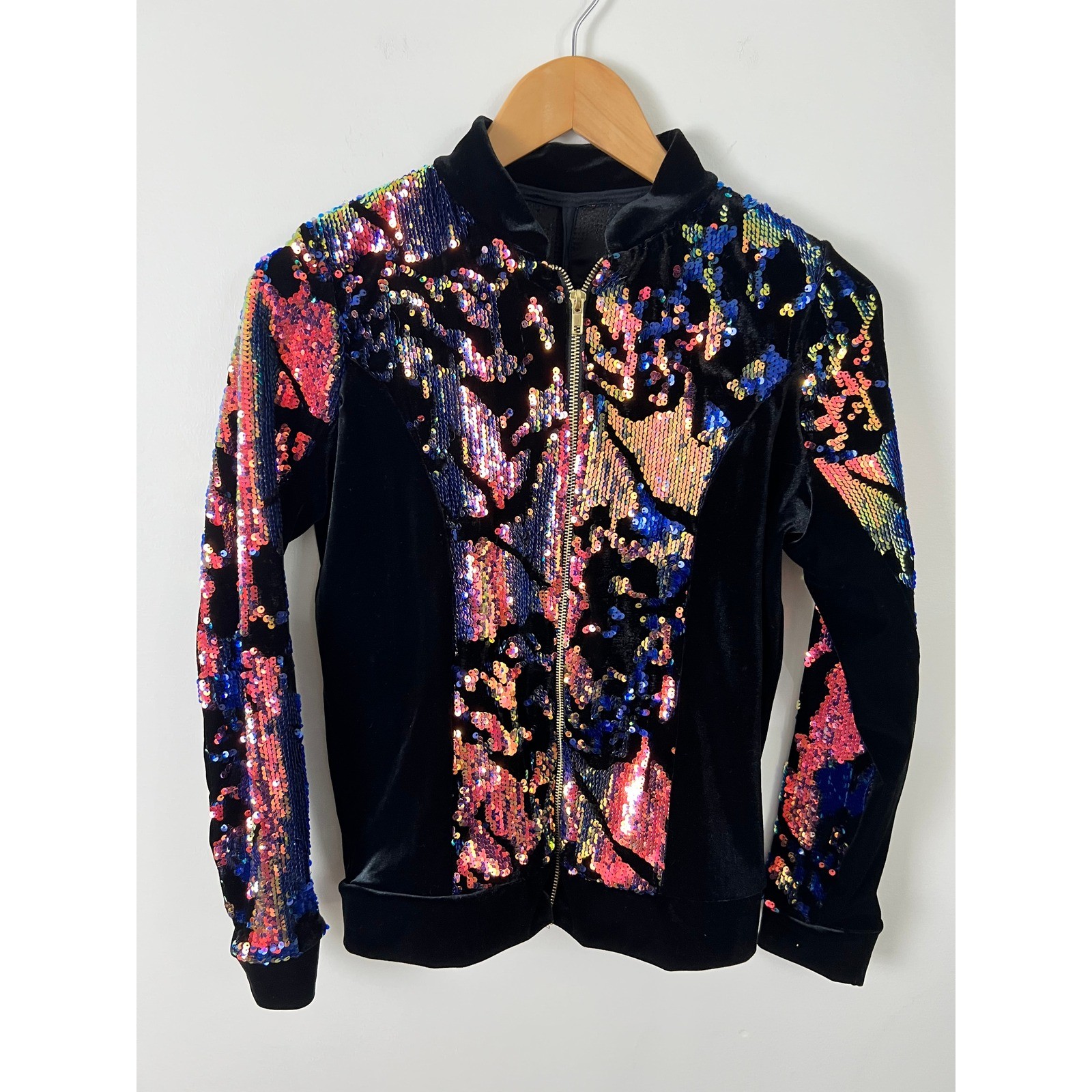 Weissman Black Velvet Sequin Bomber Jacket Rainbow Sparkle Dance Costume Top