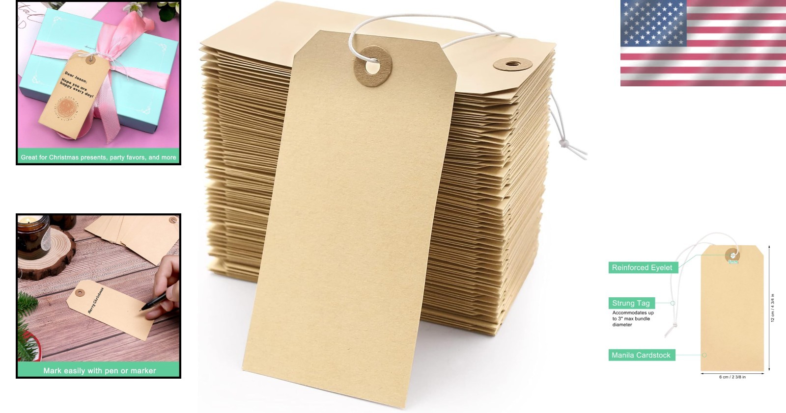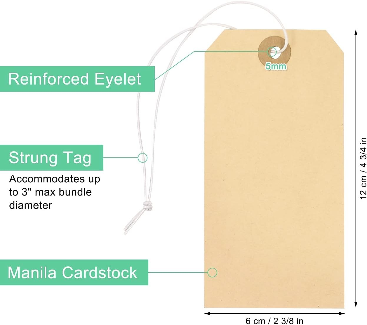 Особенности: Pre-strung, Heavy Duty, Reinforced Hole, Portable, Durable manila paper, Smooth surface, Easy to write on, Thickened paper, High-quality elastic string, Elastic rope for reuse, Structural integrity, Wide range of applications, Versatile labeling needs