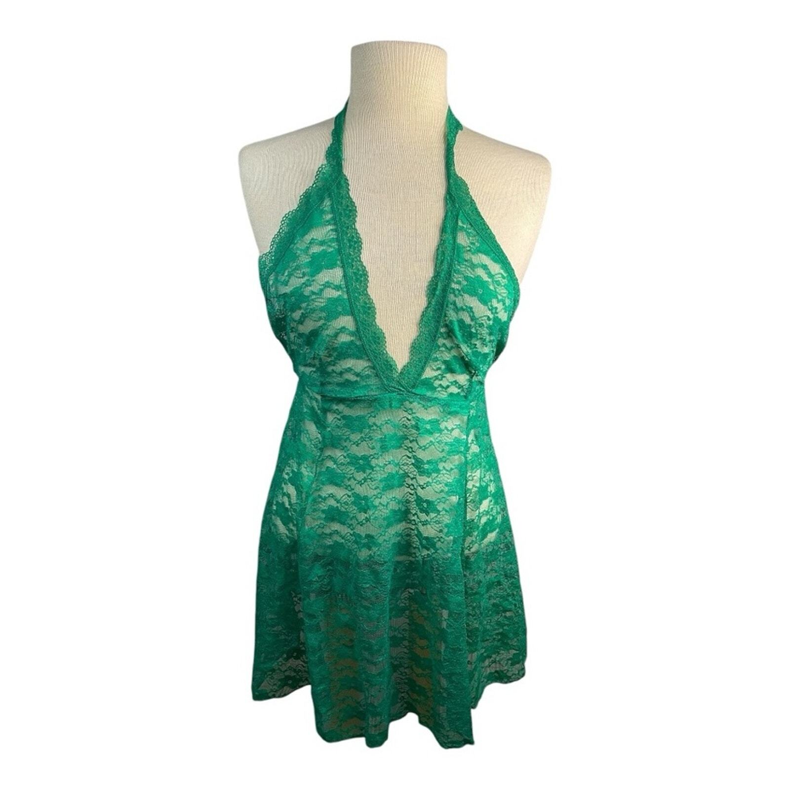 как выглядит Frederick s of Hollywood Halter 2 Piece Lace Teddy Thong Set Margherita Green M фото