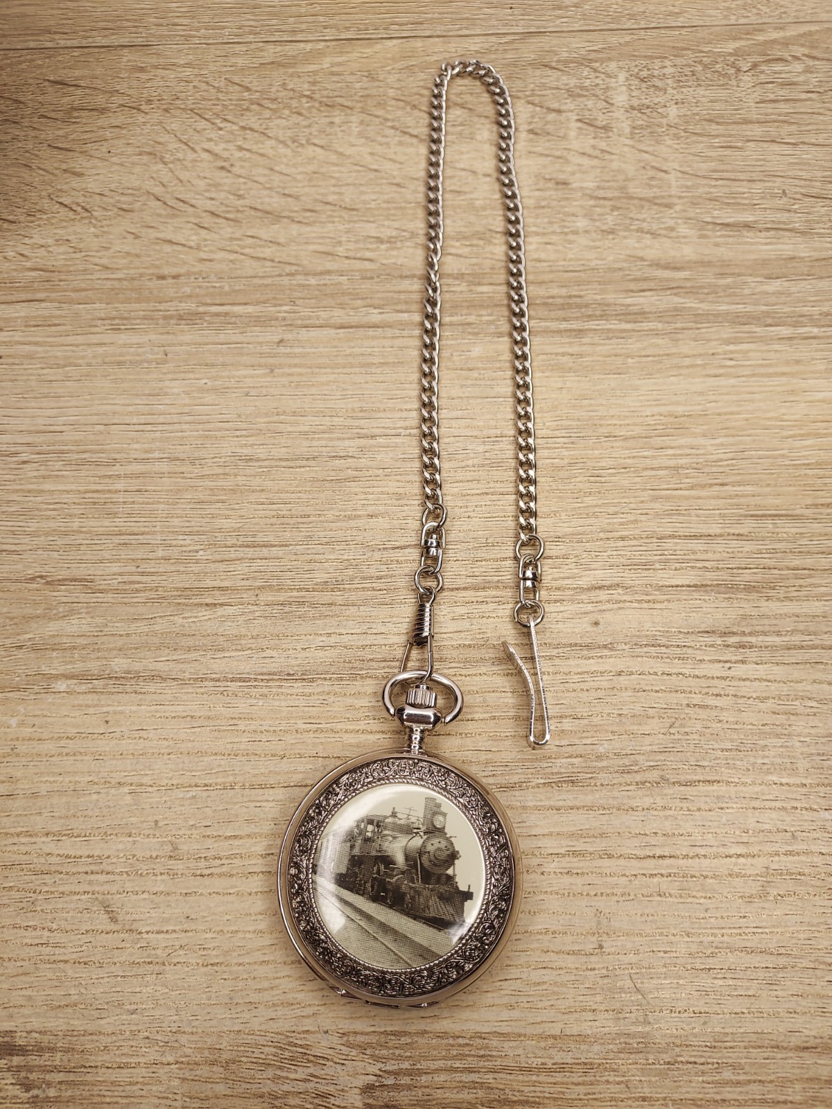 как выглядит Train Locomotive Pocket Watch with Chain Silver Tone Metal Quartz фото