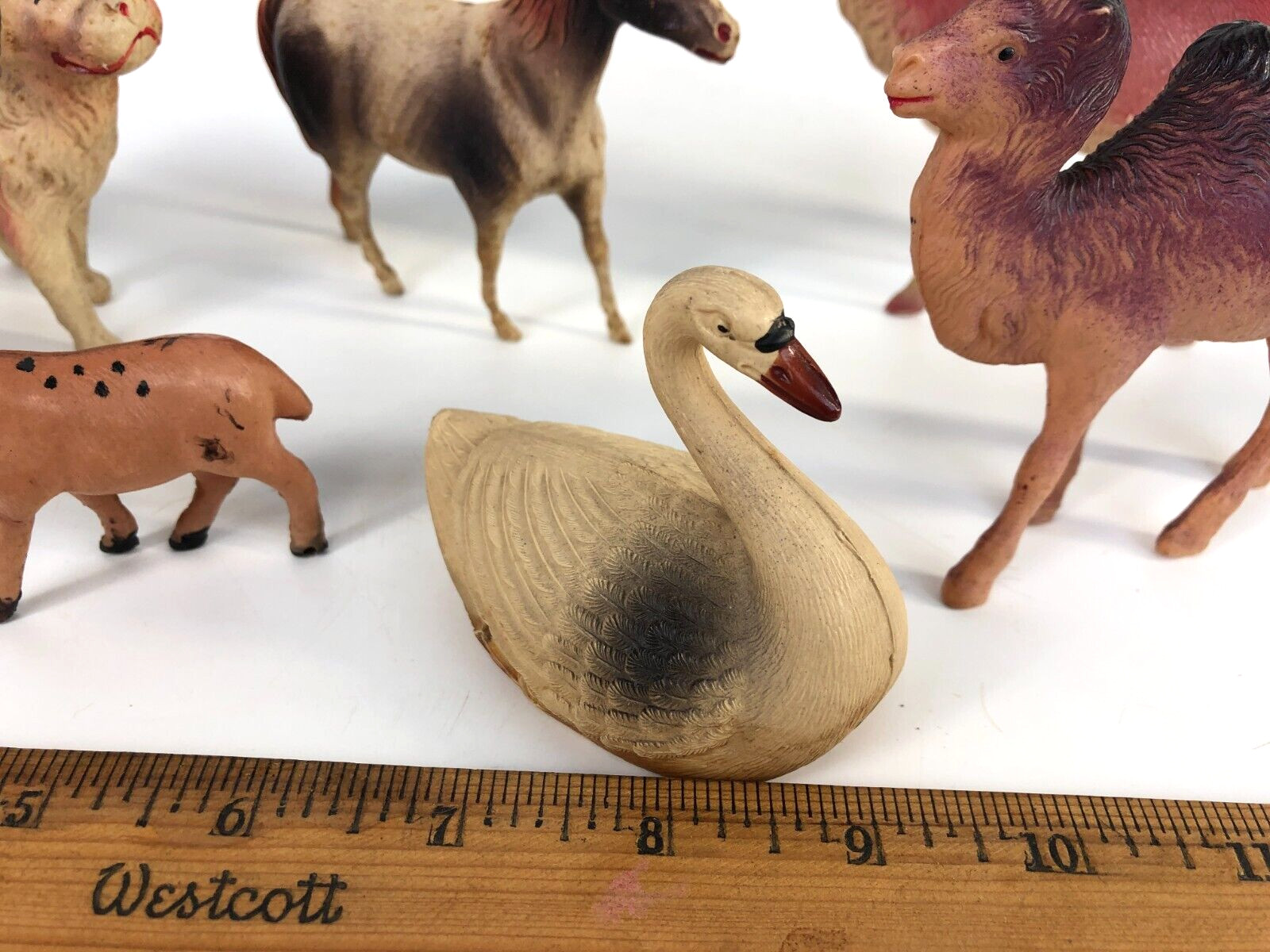 7 Antique Vintage Celluloid Animals Swan Ram Camel Dog Horse