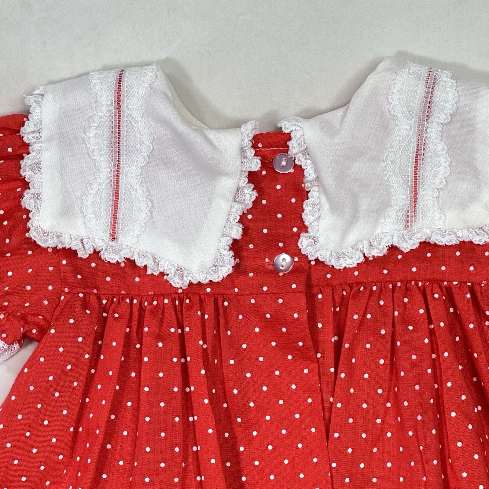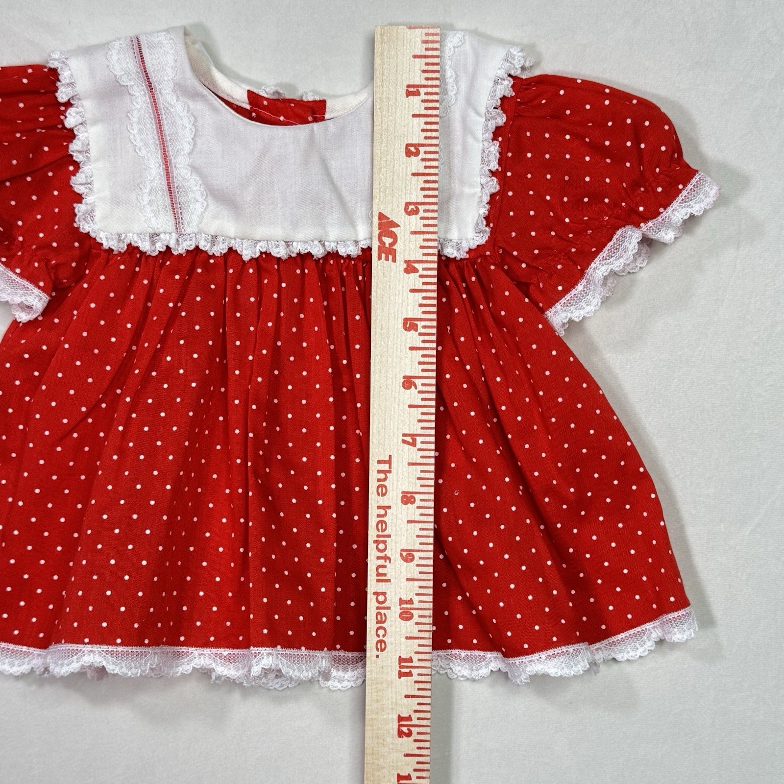 Vintage Baby Girl Red Polka Dot Dress Footed Bloomers Set Lace Trim 0-3 Months