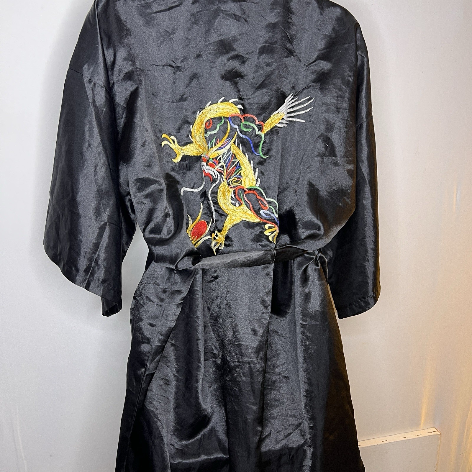 Vintage Satin Black Embroidered Asian Dragon Robe Kimono One Size OSFM L XL