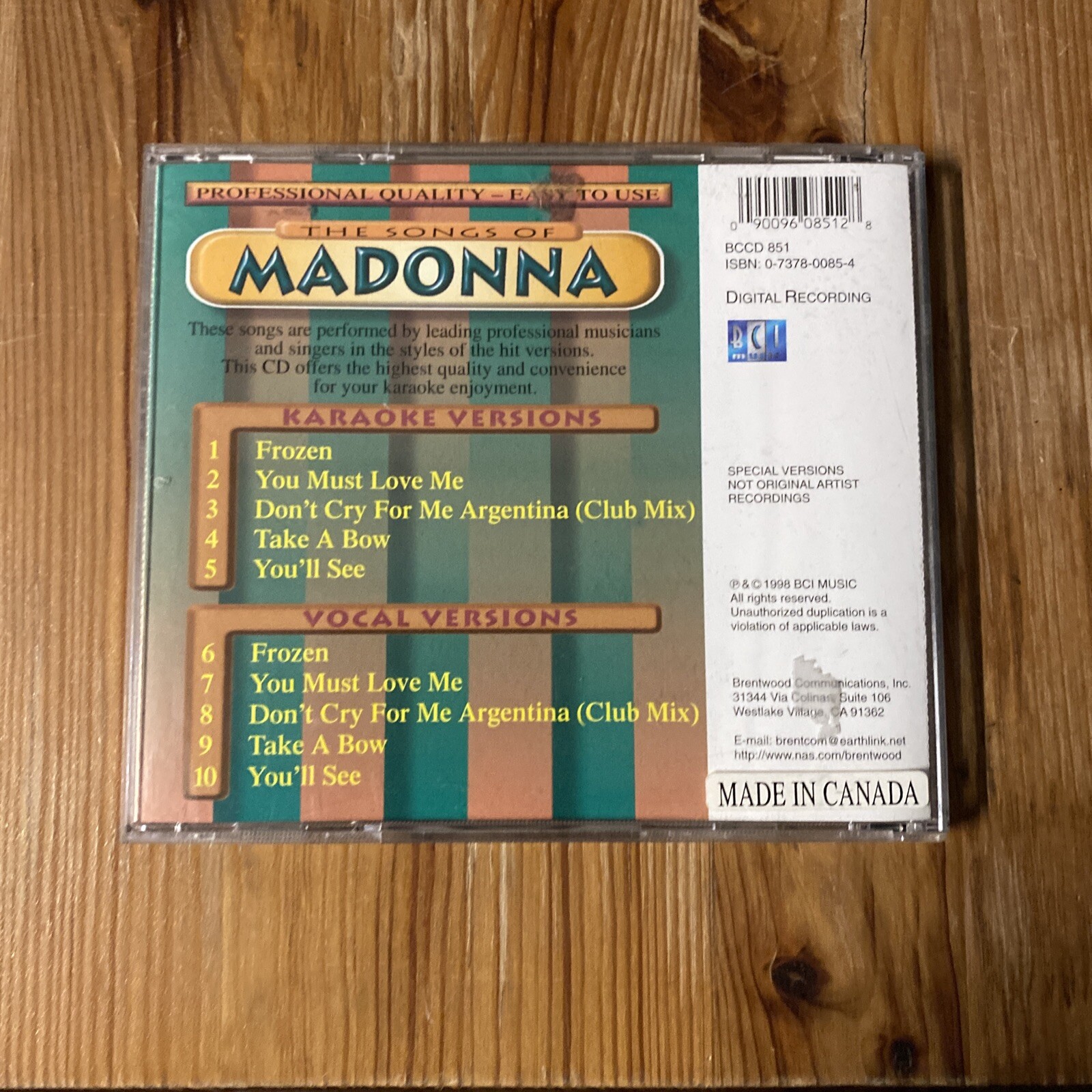 The Songs of Madonna Karaoke CD, Mar-2002, BCI Music Brentwood... NEW