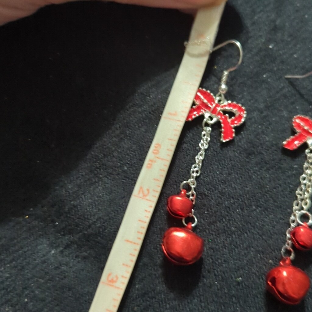 как выглядит Silver Tone Red Bow and Jingle Bells Christmas Holiday Dangle Statement Earrings фото