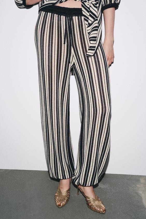 как выглядит ZARA NEW WOMAN HIGH RISE ECRU BLACK STRIPED LINEN CUFFED HEM BALLOON PANTS sz M фото