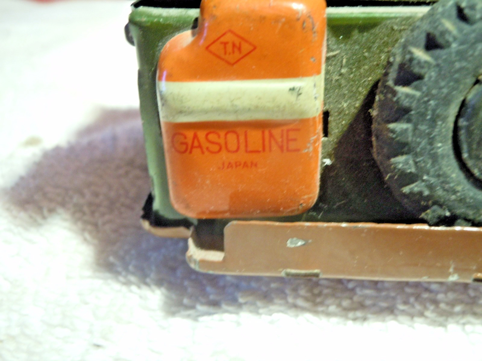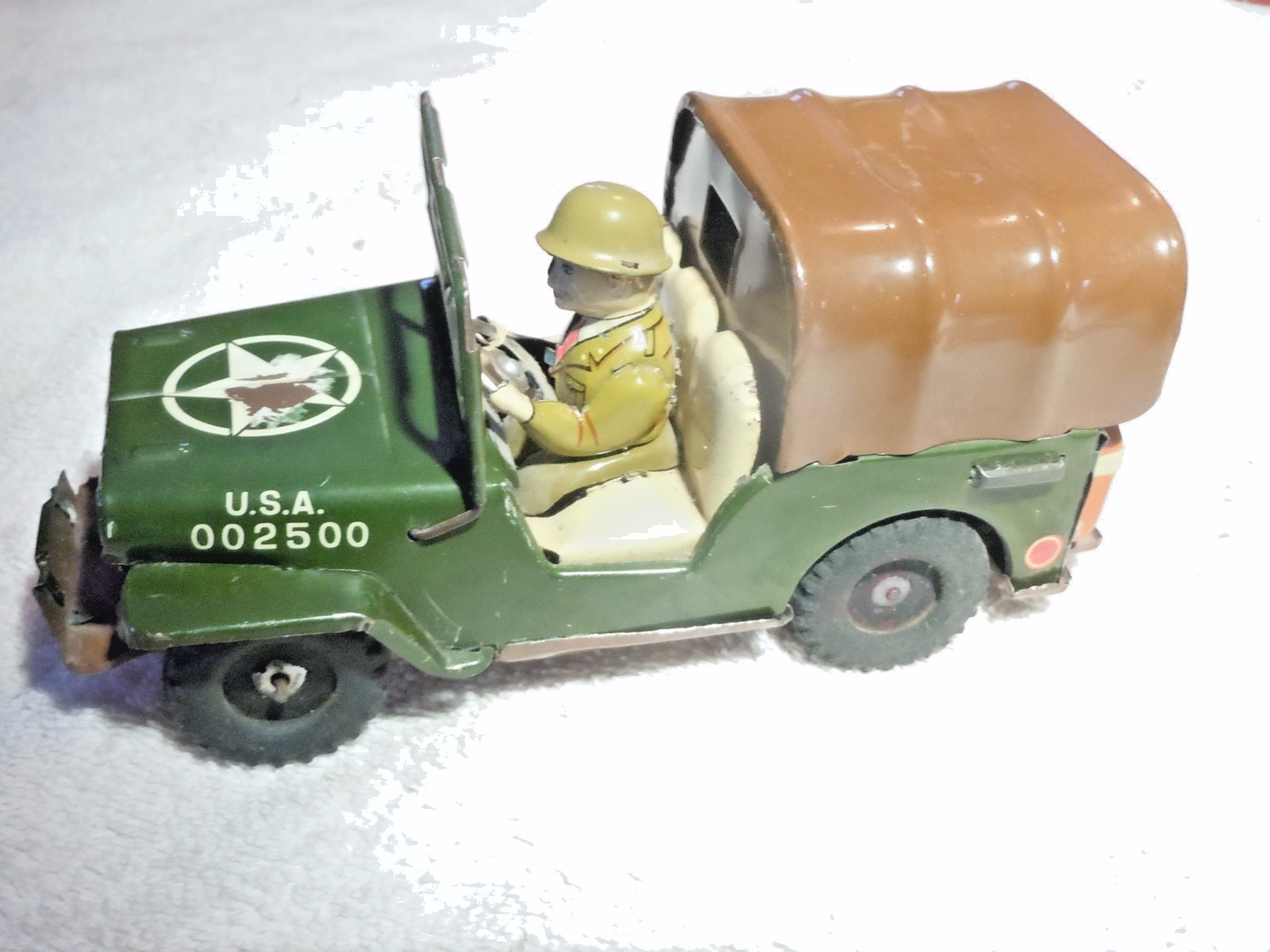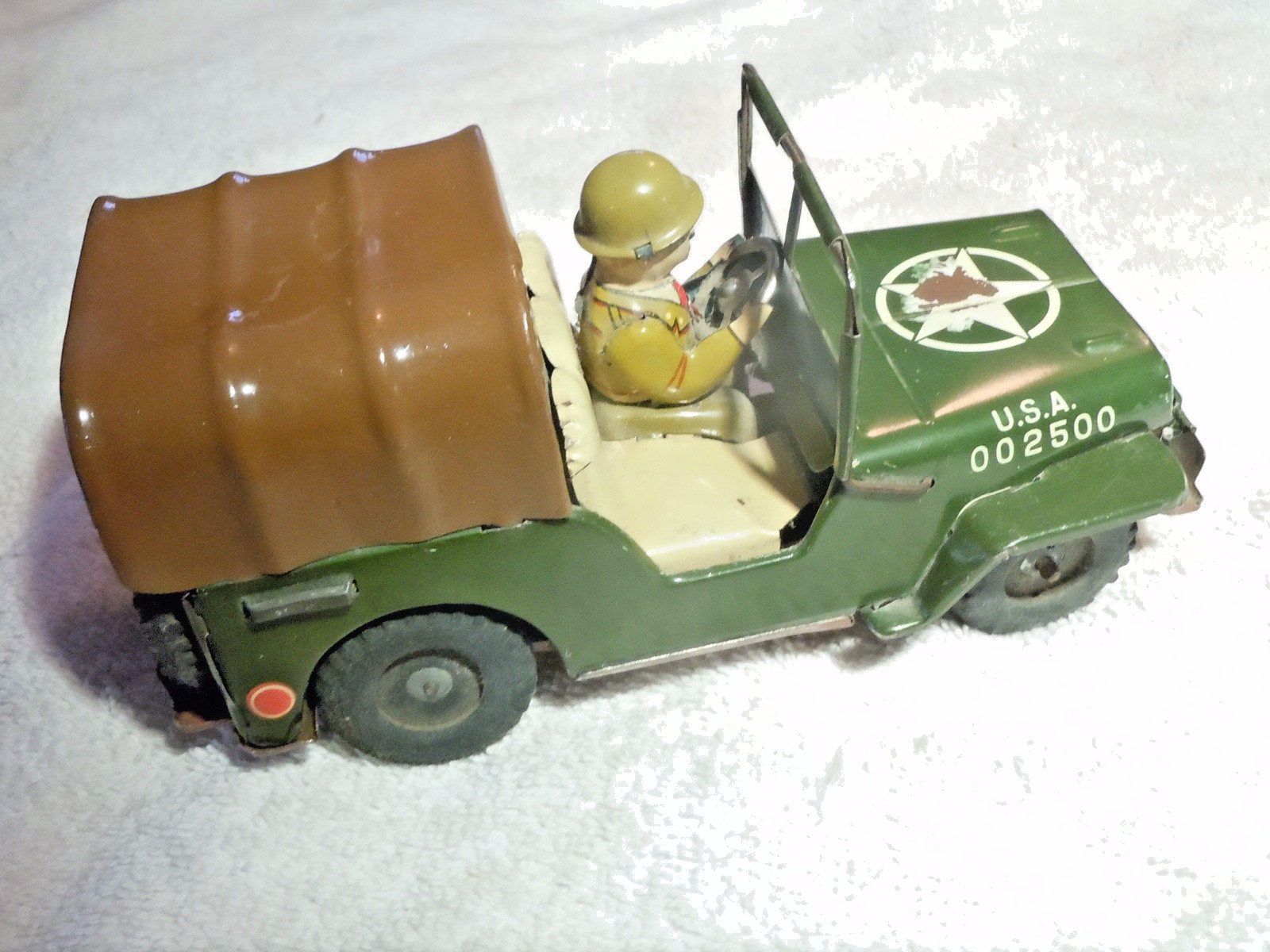 6-1/2 GREEN JAPANESE TIN ARMY JEEP WITH DRIVER FIGURE, METAL CARGO COVER
