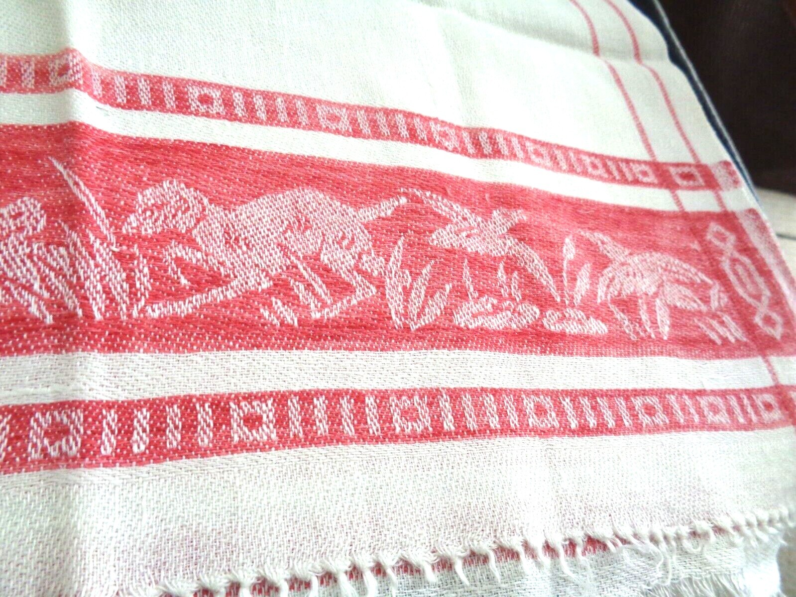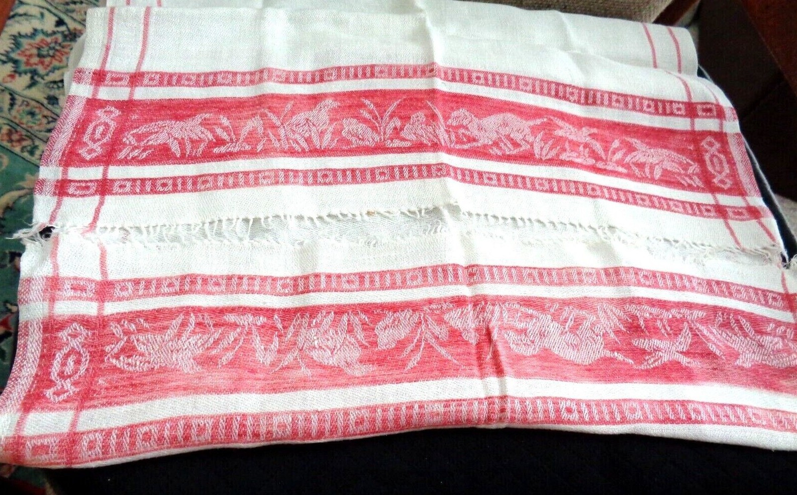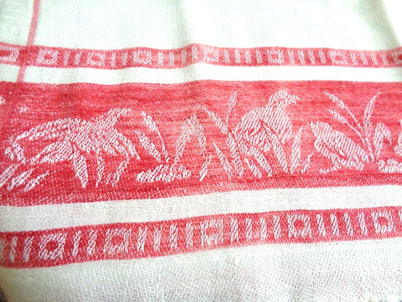 Antique Vtg Kitchen Bath Guest Towel Wht Cotton Red Bird Hound Design Border
