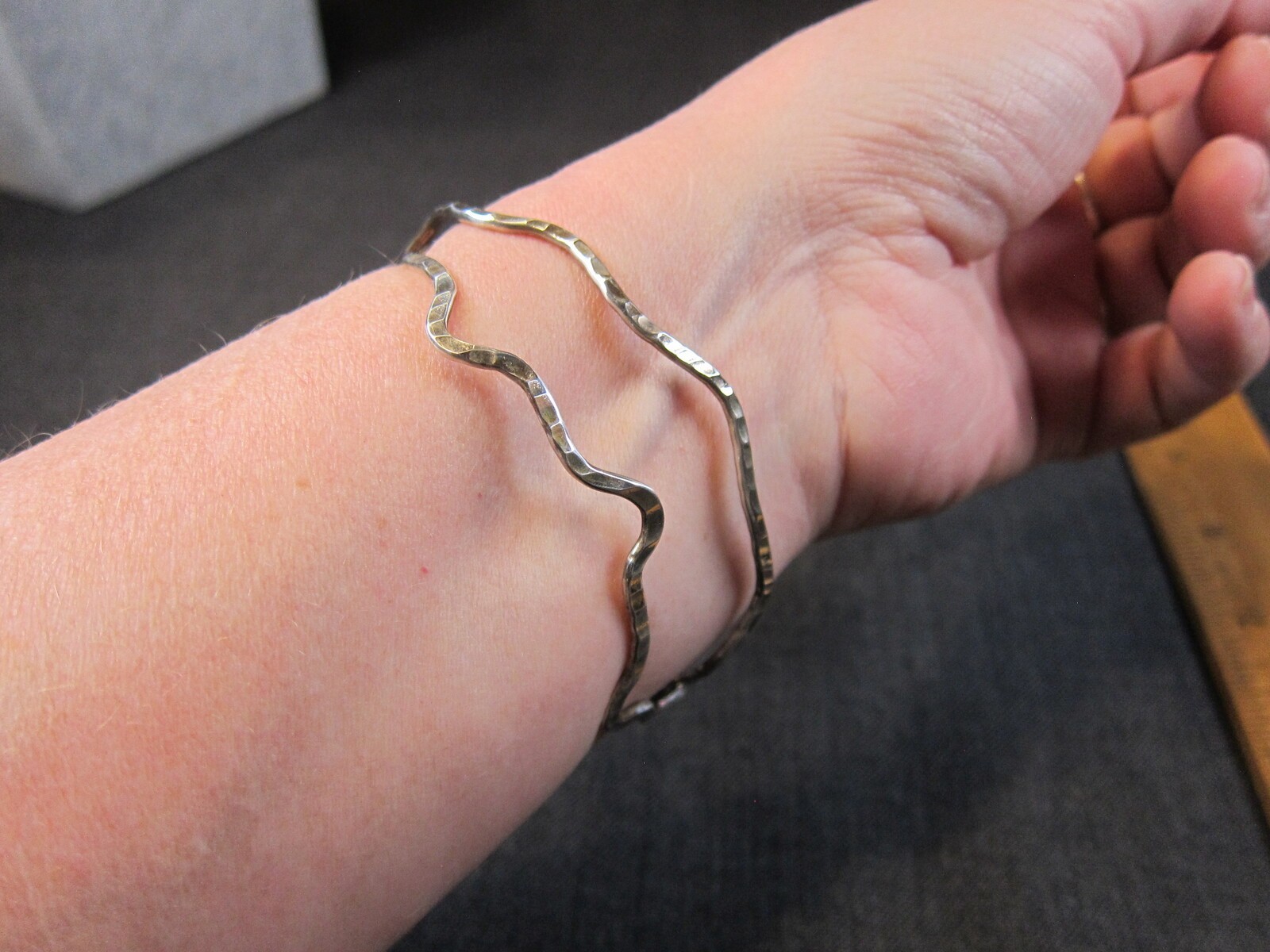 как выглядит Set of 2 neat modernist sterling silver hammered wavy bangle bracelets 14.5g фото