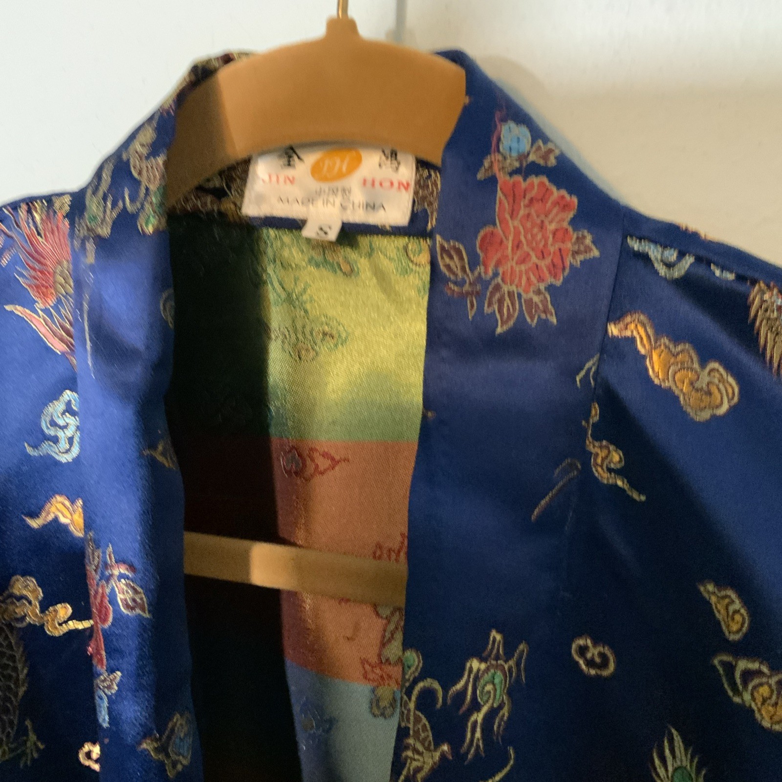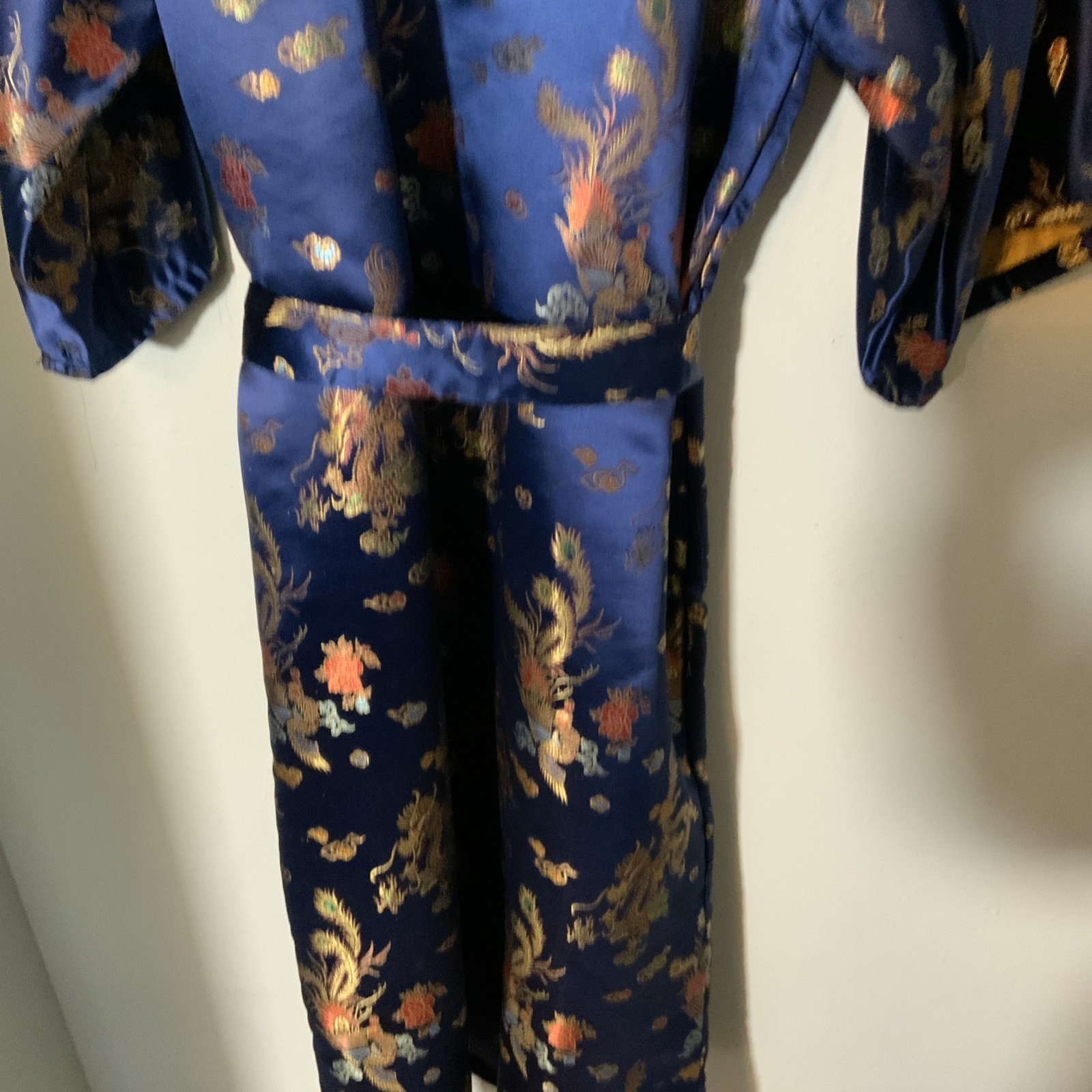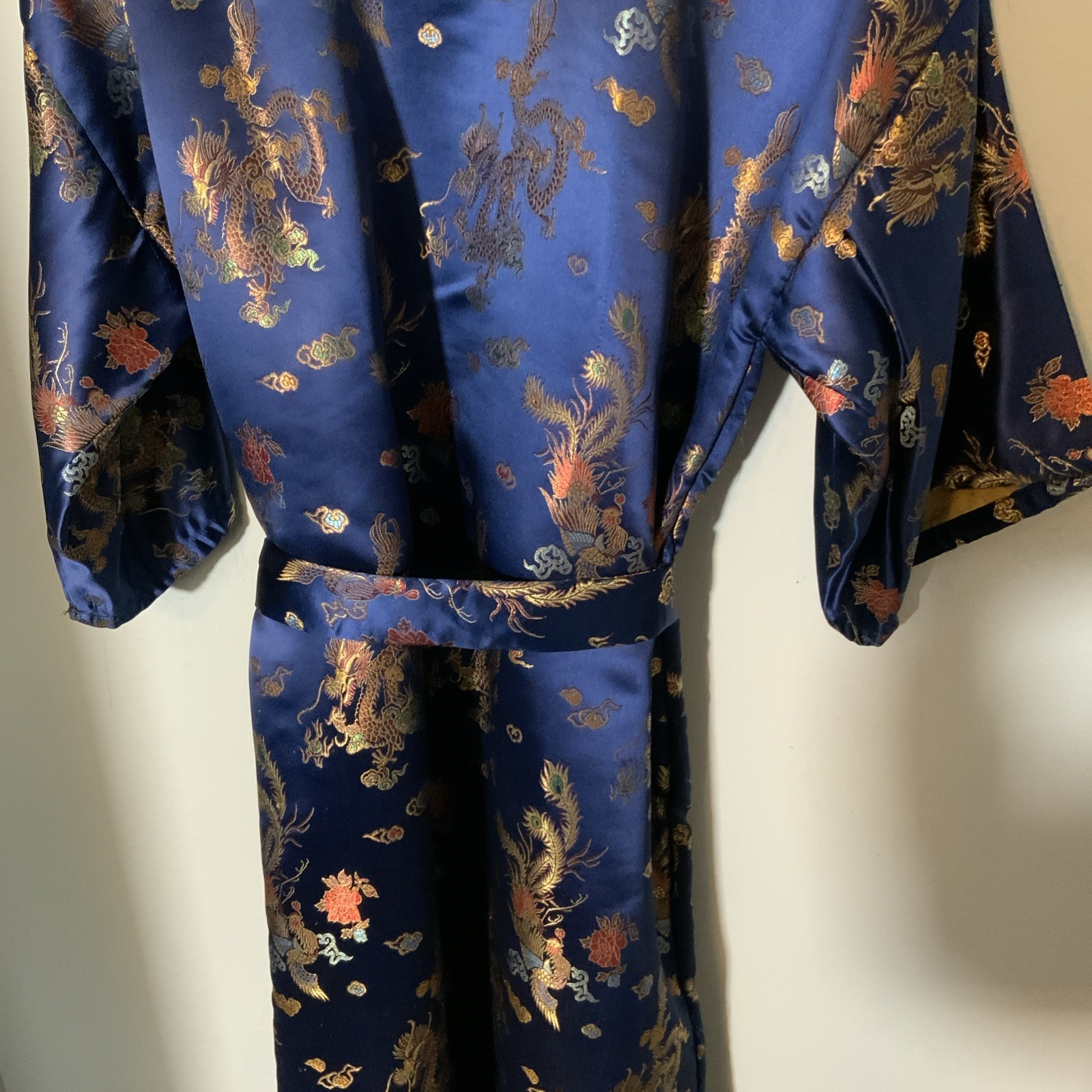 Jin Hon Oriental Blue Rayon Satin Jacquard Japan Belted Robe Kimono Dragons SM