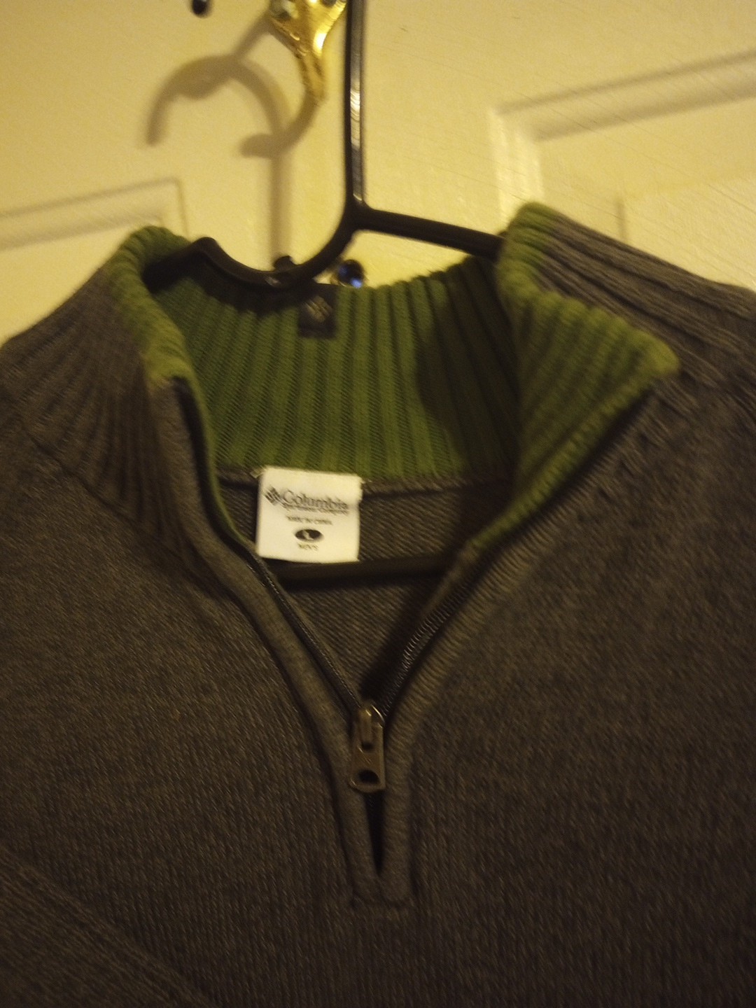 Columbia Mens L 100 Cotton 1/4 Zip Mockneck Sweater Gray With Green Trim