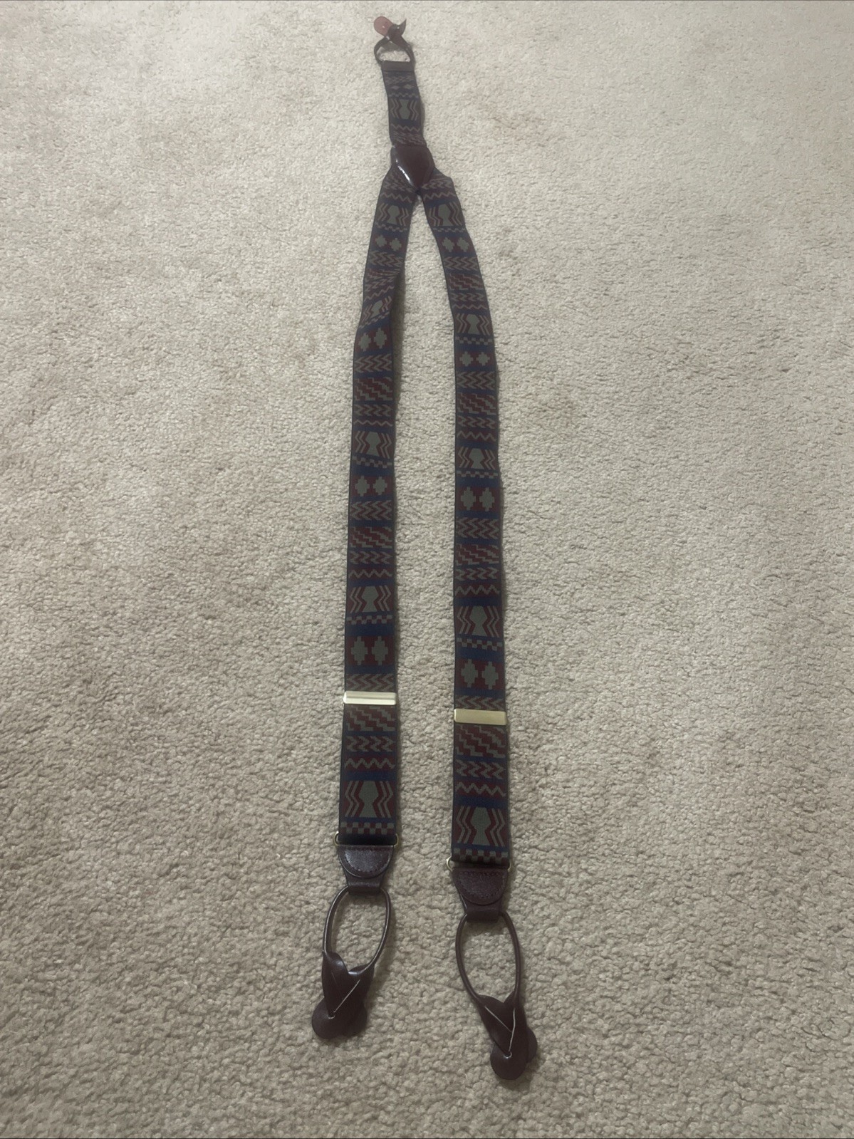 Vintage CAS Germany Suspenders Button Braces Leather Geometric Sage Green Preppy