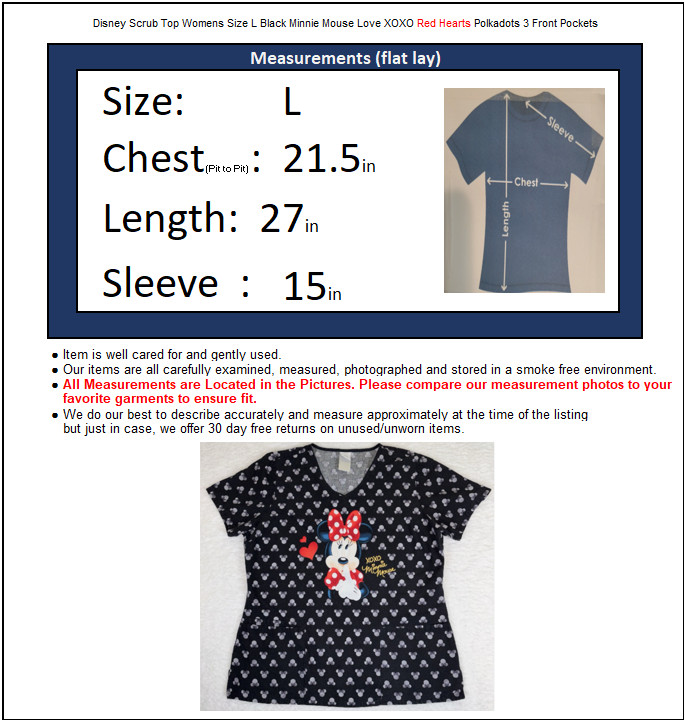 как выглядит Disney Scrub Top Womens Size L Black Minnie Mouse Love XOXO Red Hearts Polkadots фото
