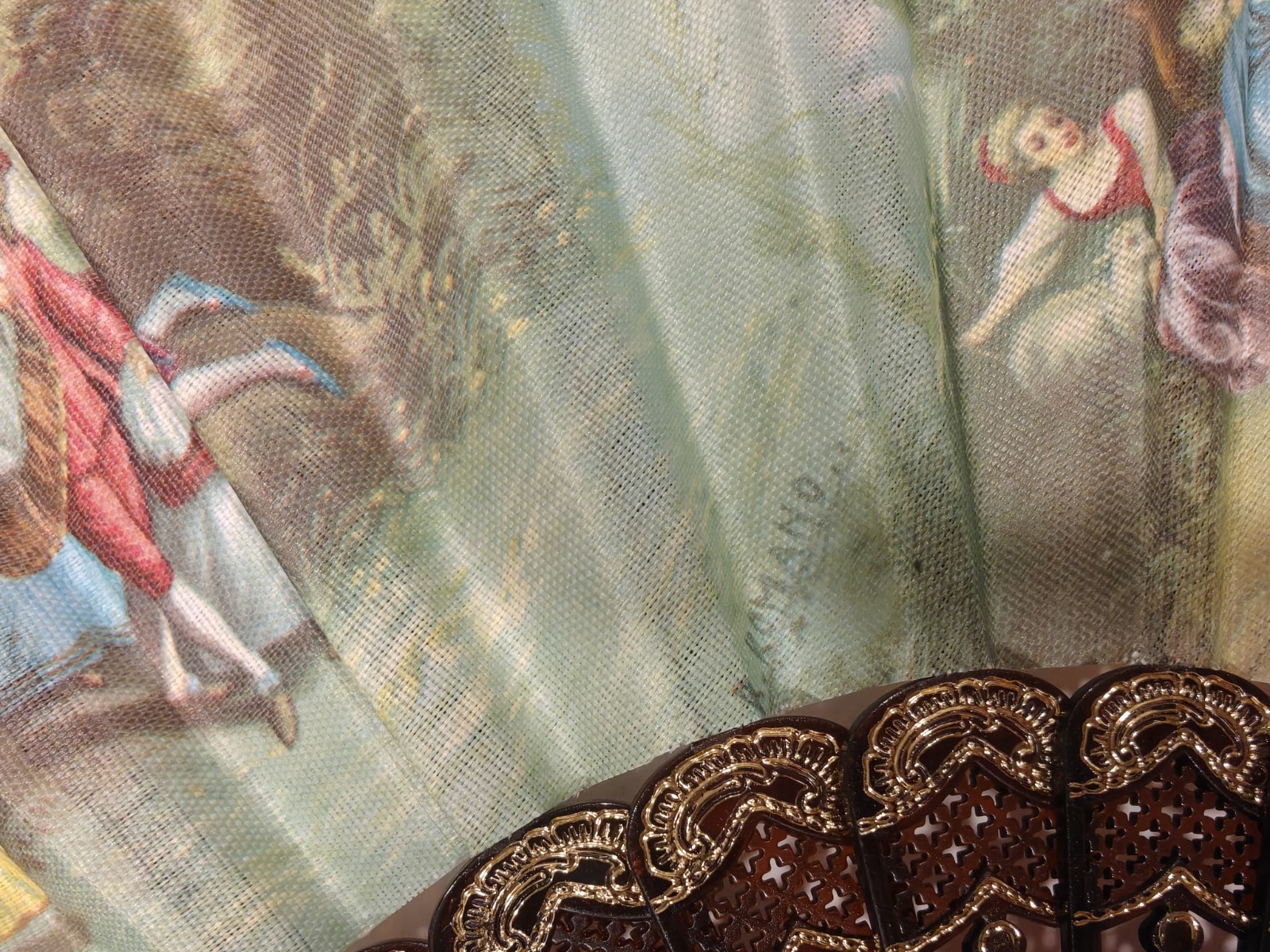 как выглядит Vintage Ornate 18 Hand Fan Black Lace Colonial Scene R. Romano Signed Abanico фото