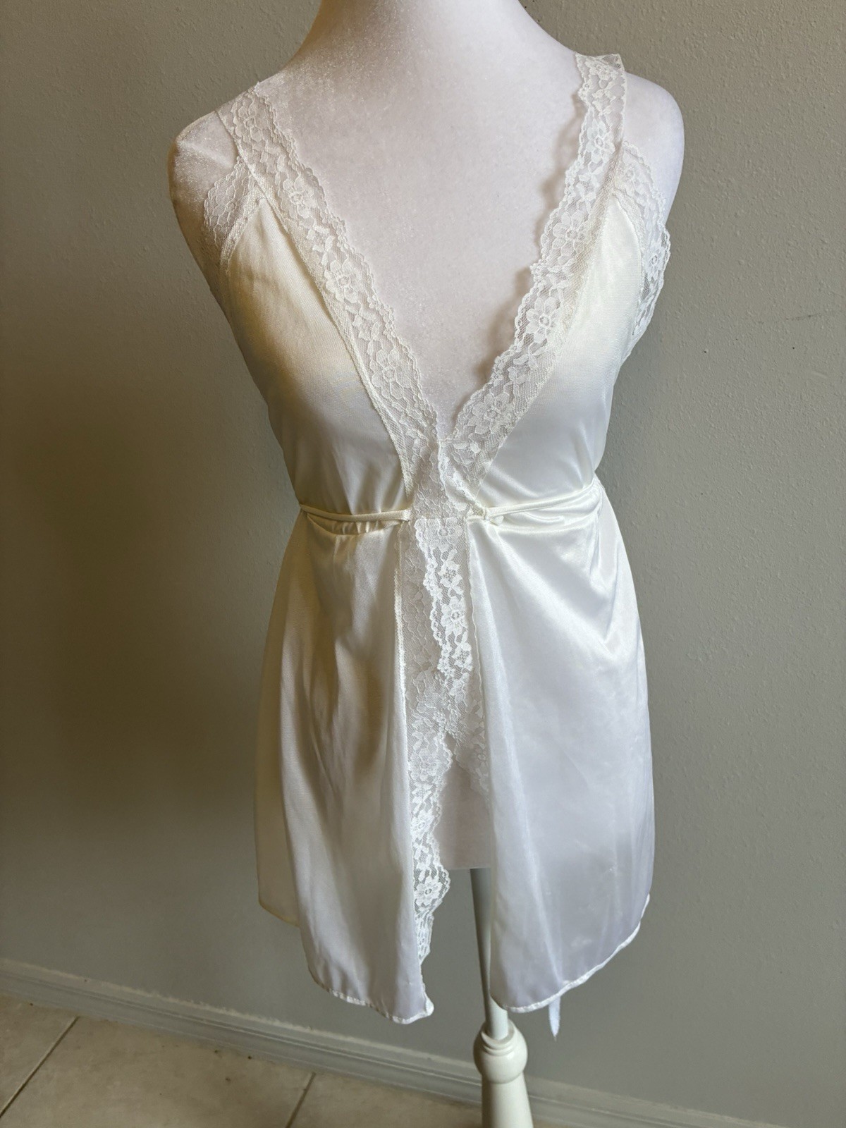 как выглядит VTG Ivory Lace Satin Babydoll Slip Nightie Chemise Open Front Bridal Romantic L фото