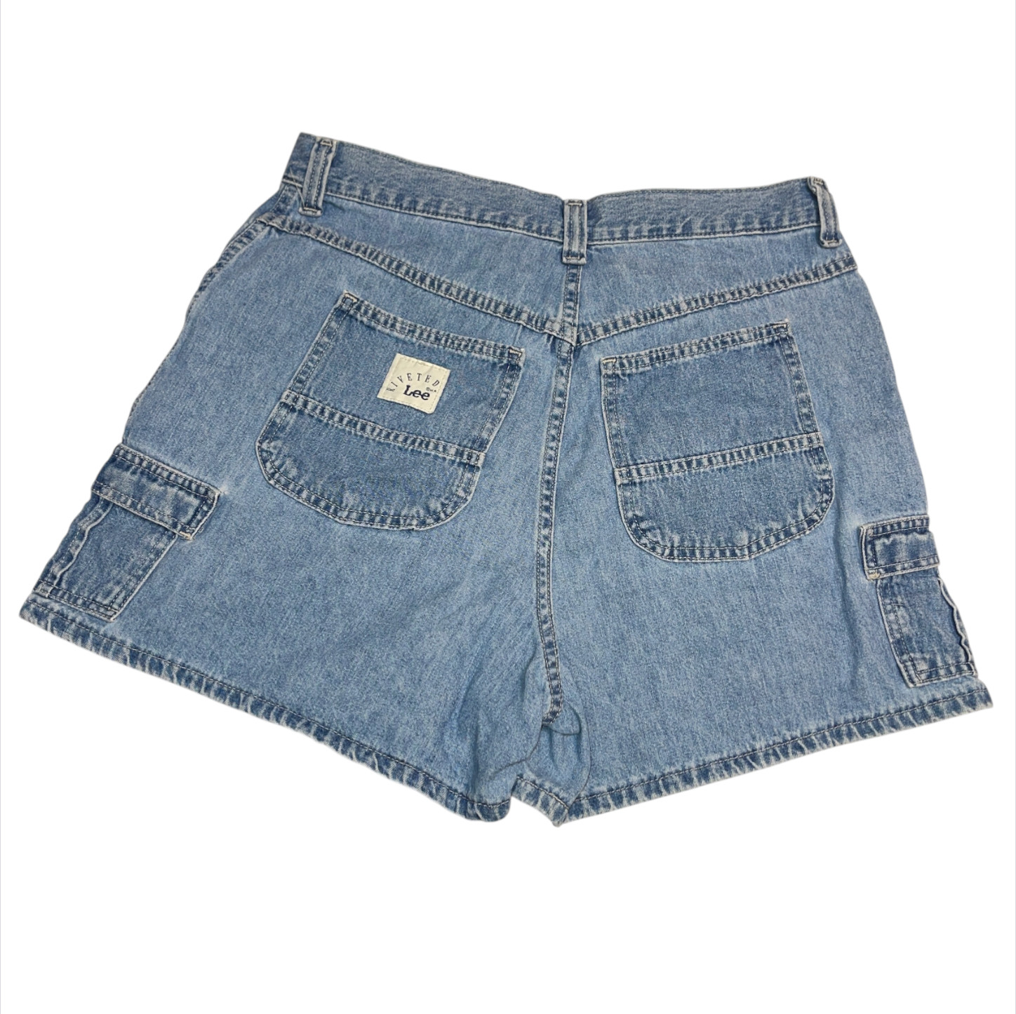 Vintage Lee Riveted Denim Jean Cargo Shorts Women s Sz 14 P Medium Wash USA Made