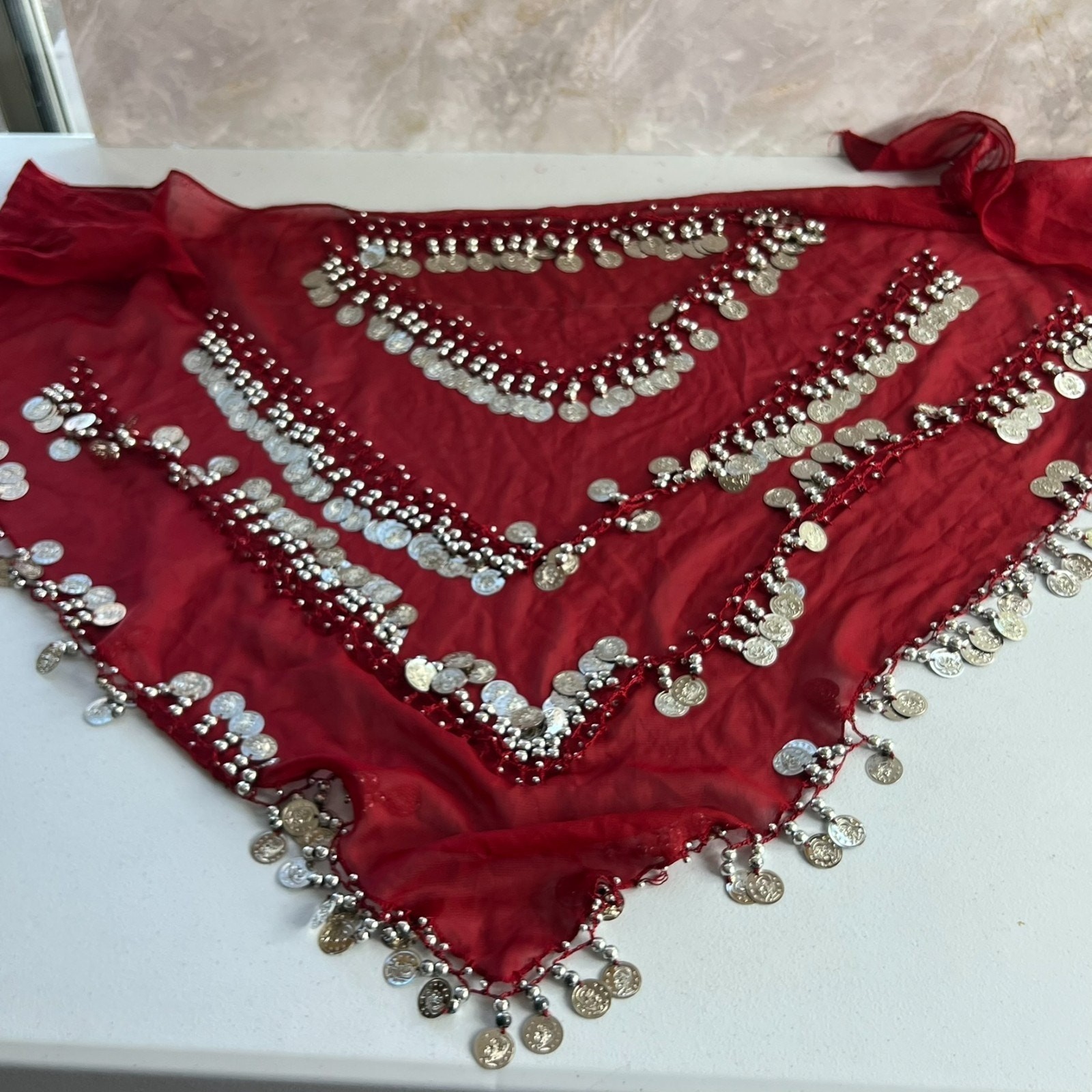 как выглядит Belly Dance Hip Scarf Triangle Shape Sheer Fabric Faux Silver Coins фото