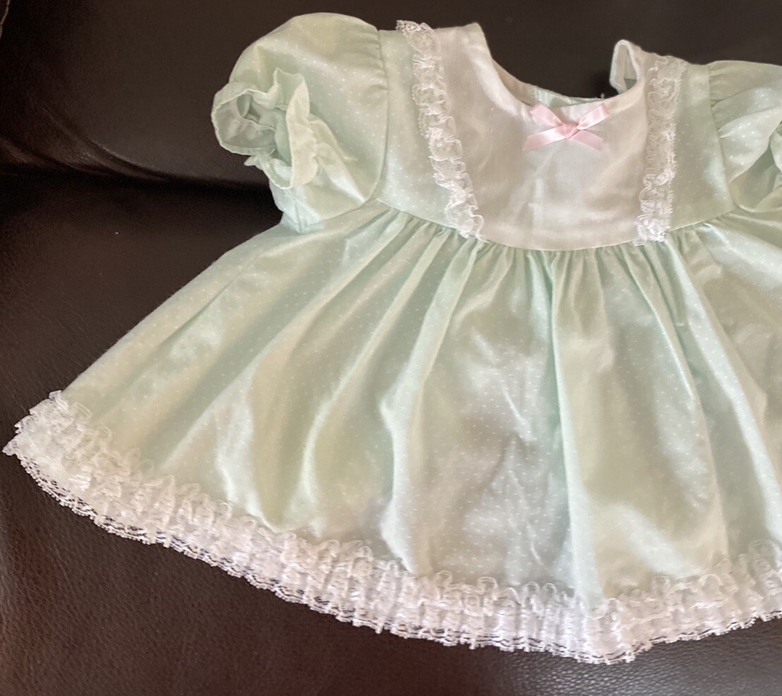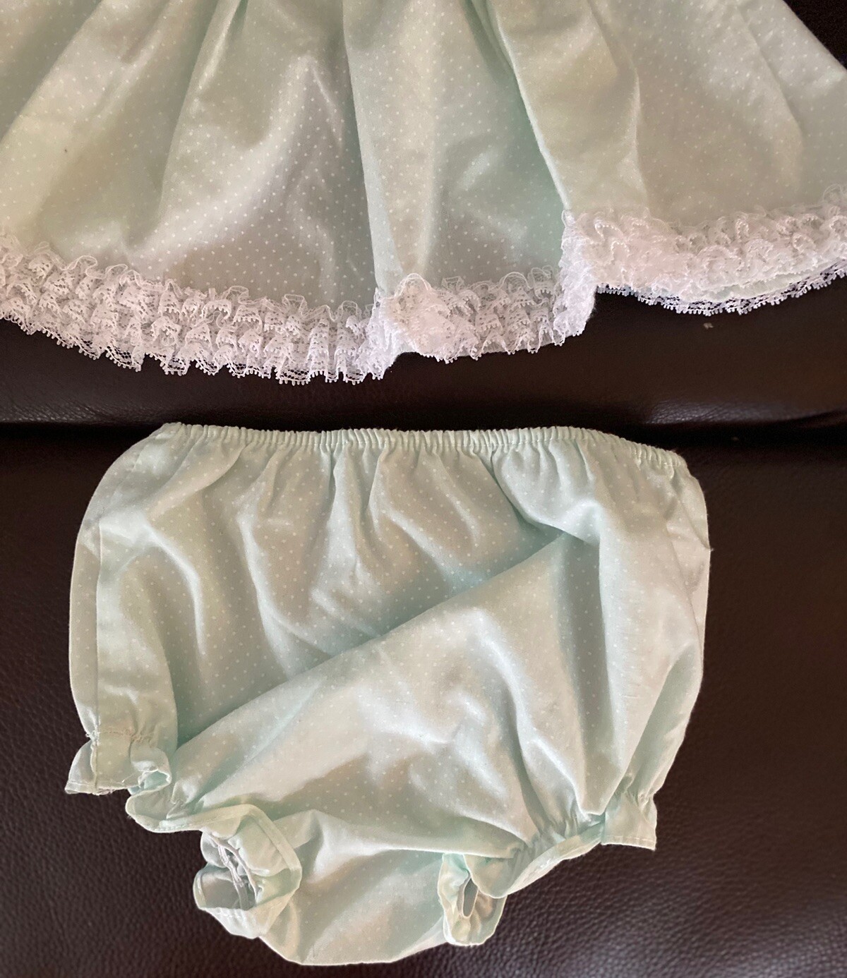 VINTAGE JOLENE 6-9M GREEN W/ WHITE LACE BABY DRESS AND DIAPER COVER USA