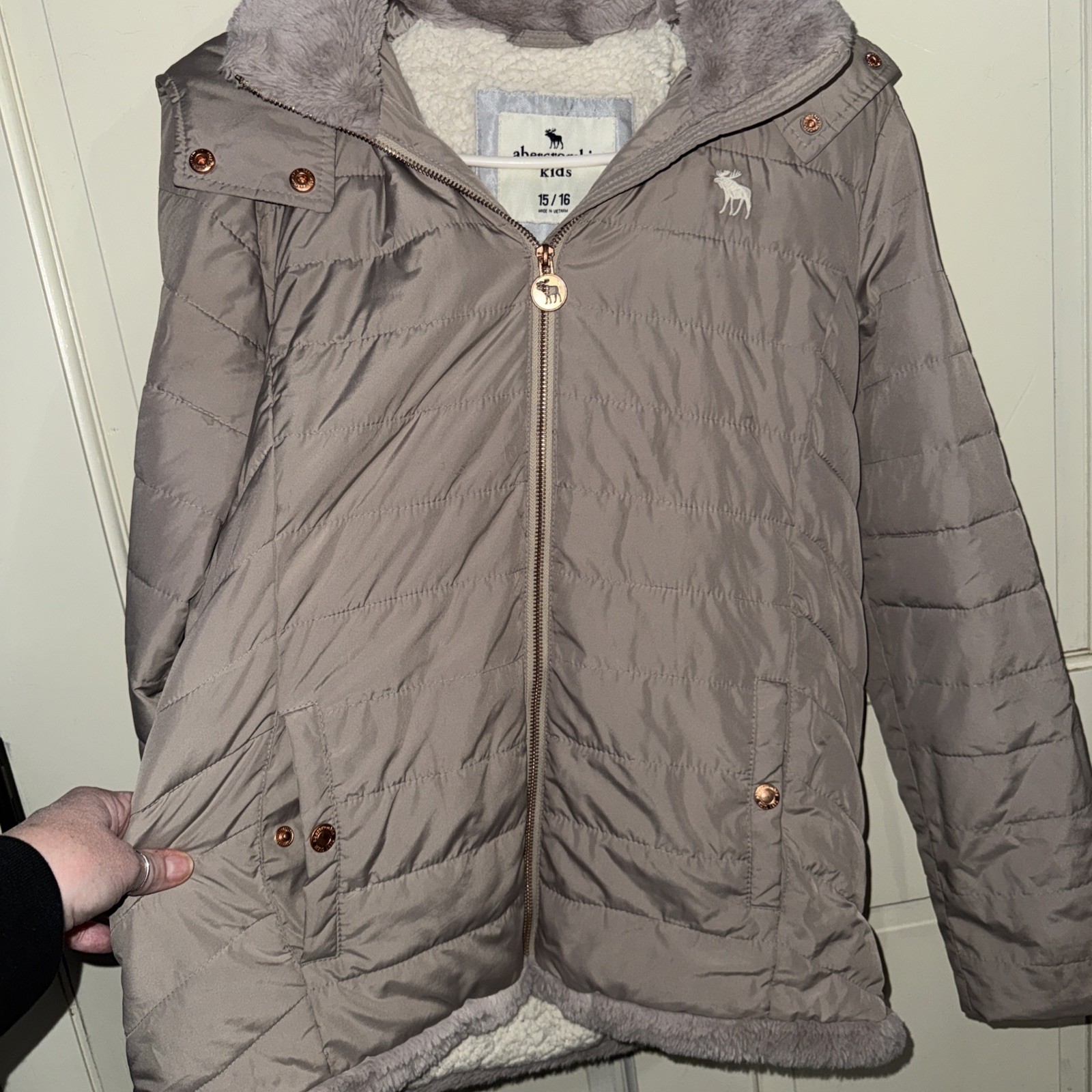 как выглядит Abercrombie Kids Beige Puffer Jacket Size 15/16 Faux Fur Hood Sherpa Lined фото