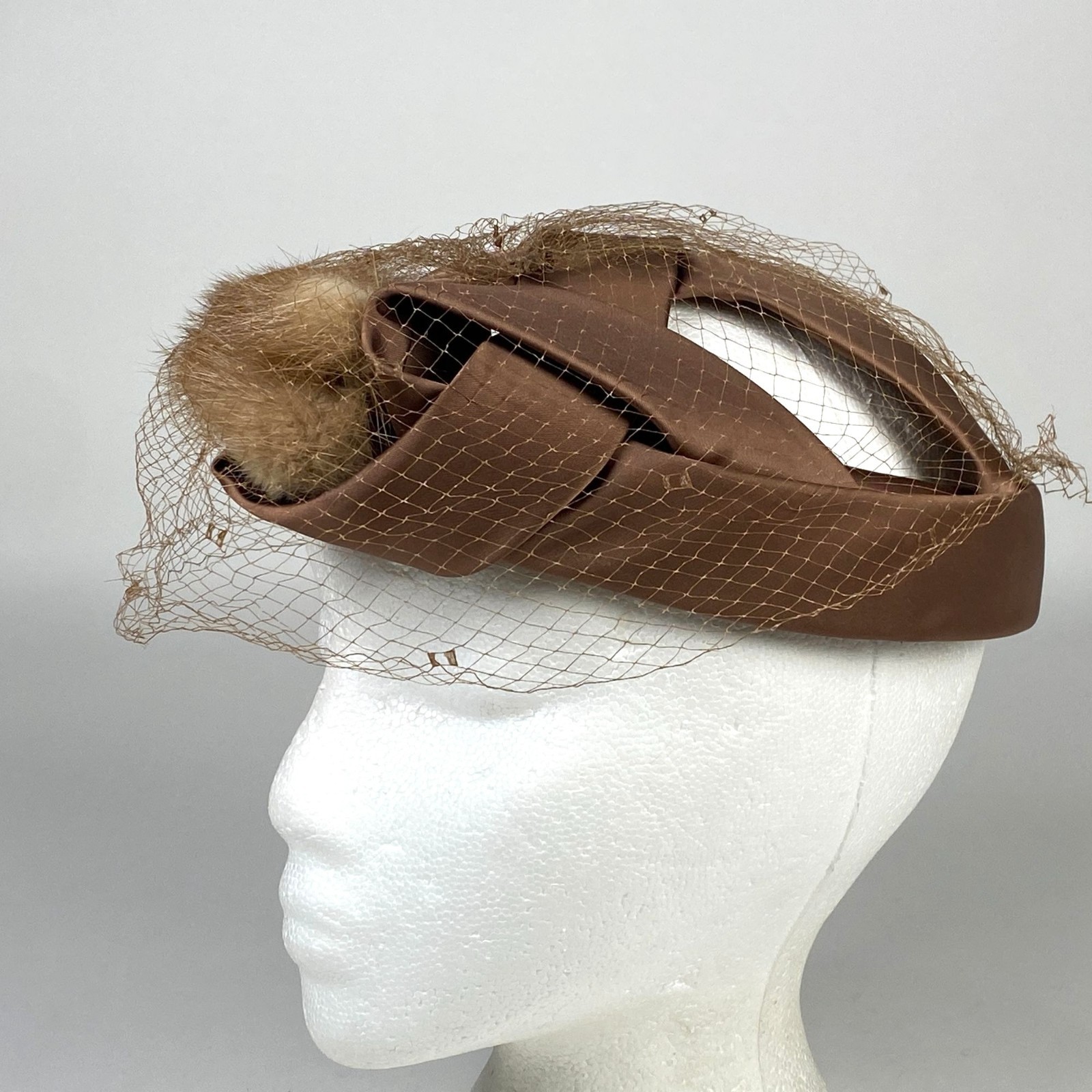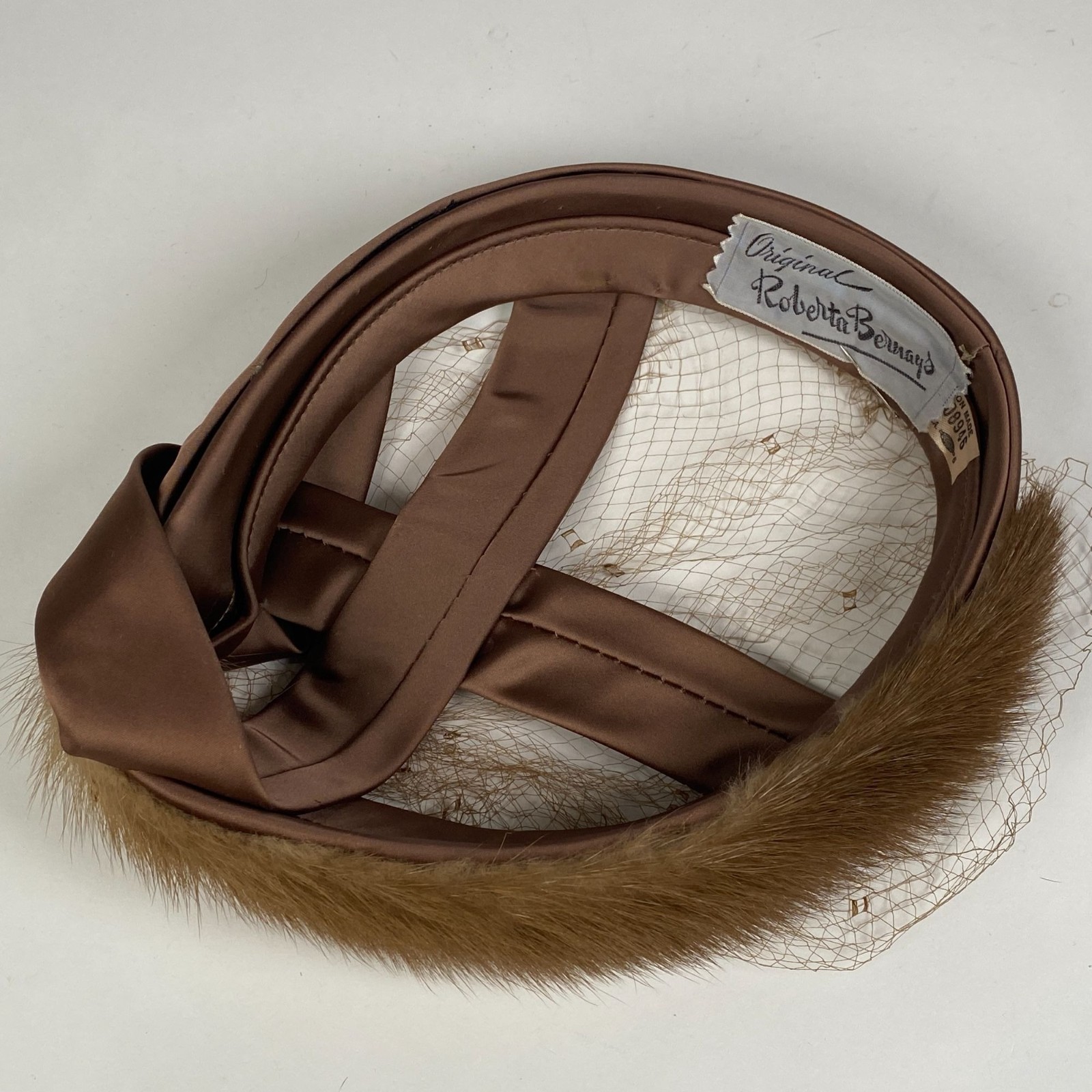 Vintage Roberta Bernays Brown Fur Satin Fascinator Hat Birdcage Veil Made USA