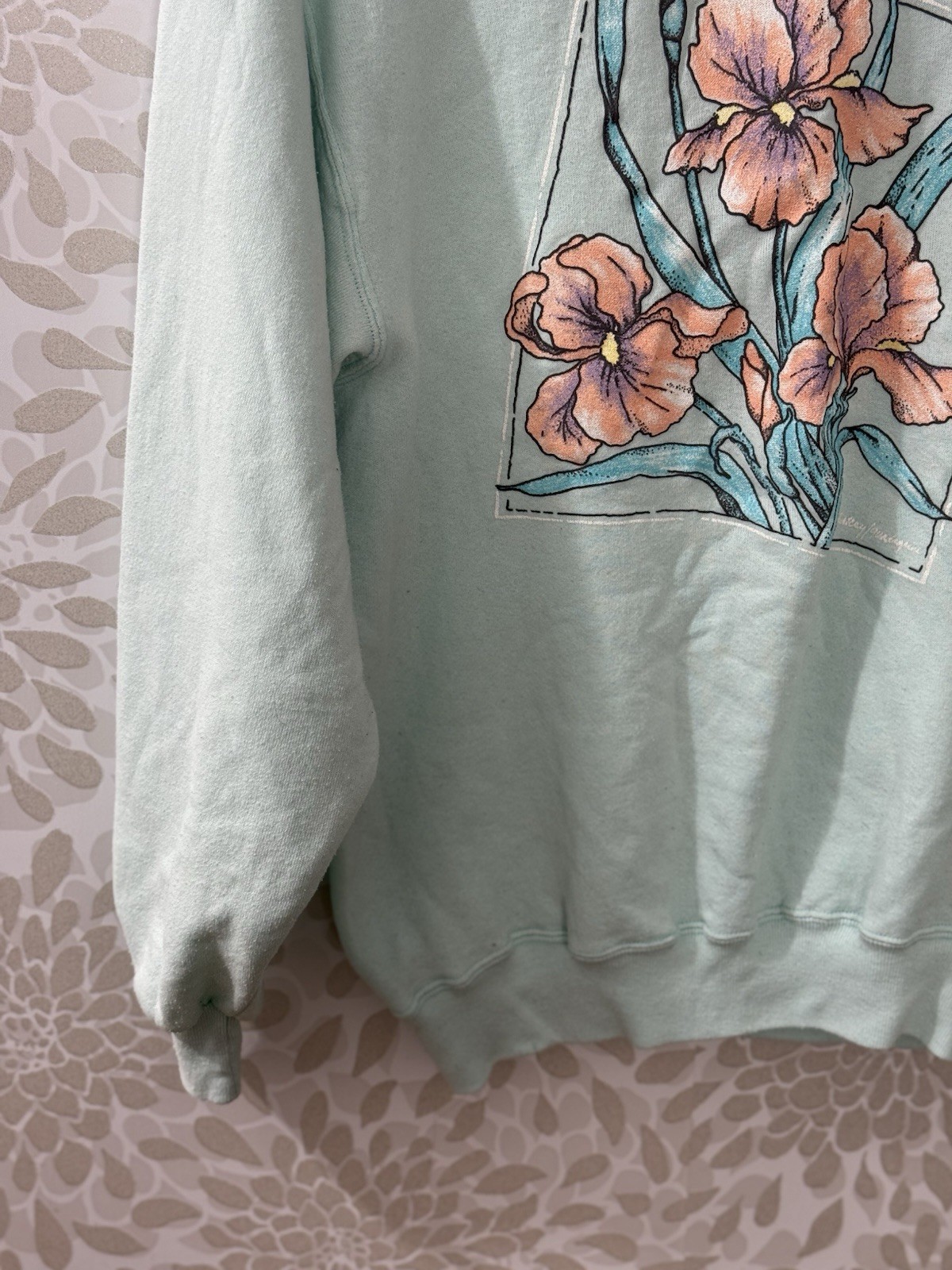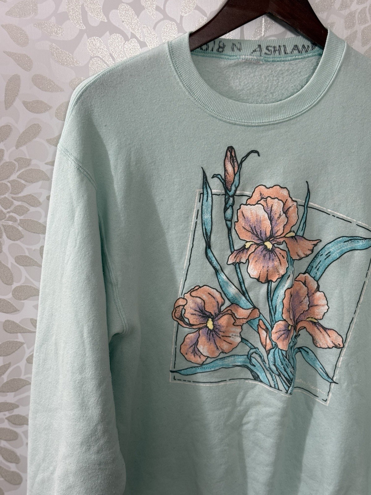 Vintage 80s 90s Women s M L Mint Green Lillies Flower Screen Print Sweatshirt