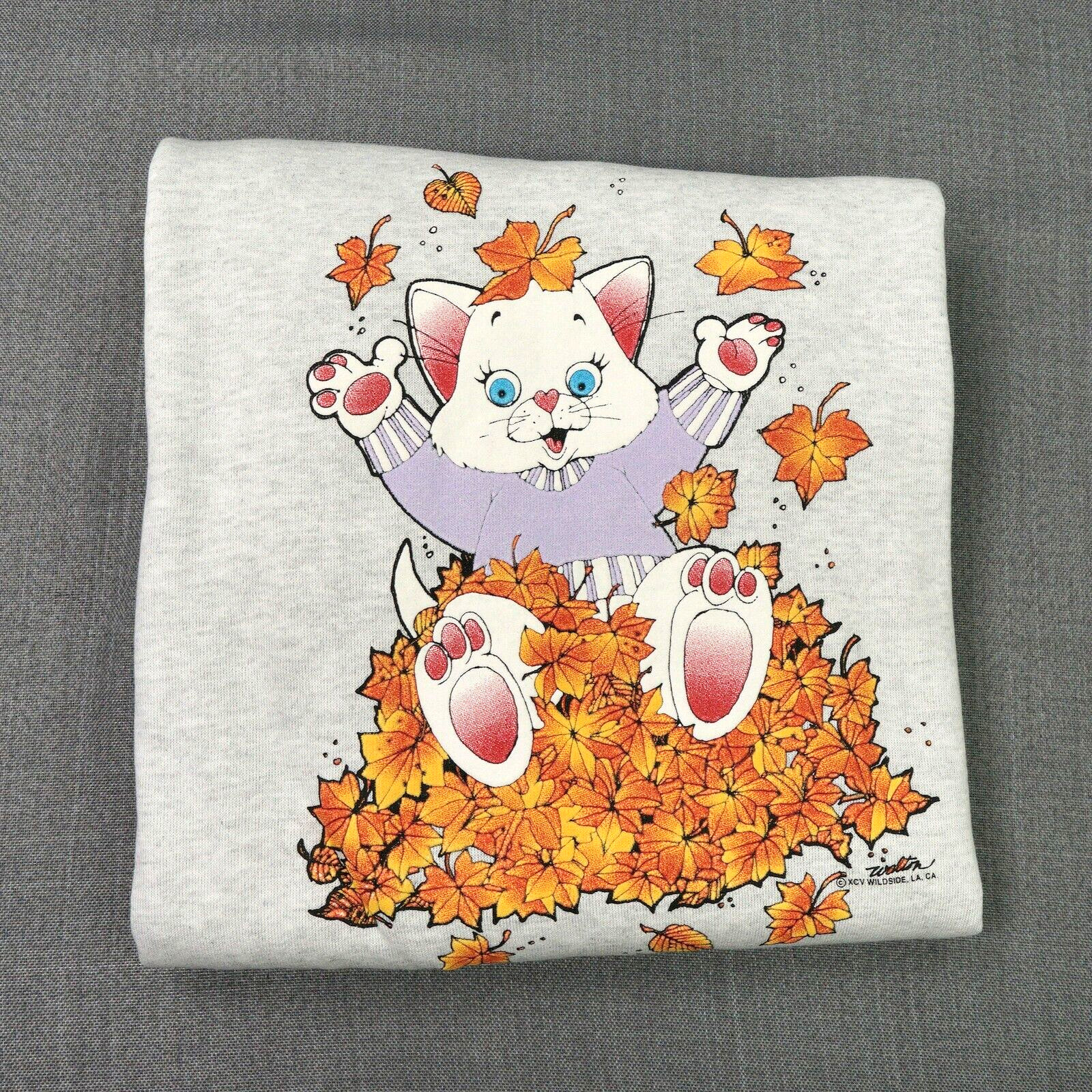 VINTAGE 90S CAT SWEATSHIRT WOMENS XL GRAY AUTUMN LEAVES GRAPHIC PULLOVER USA