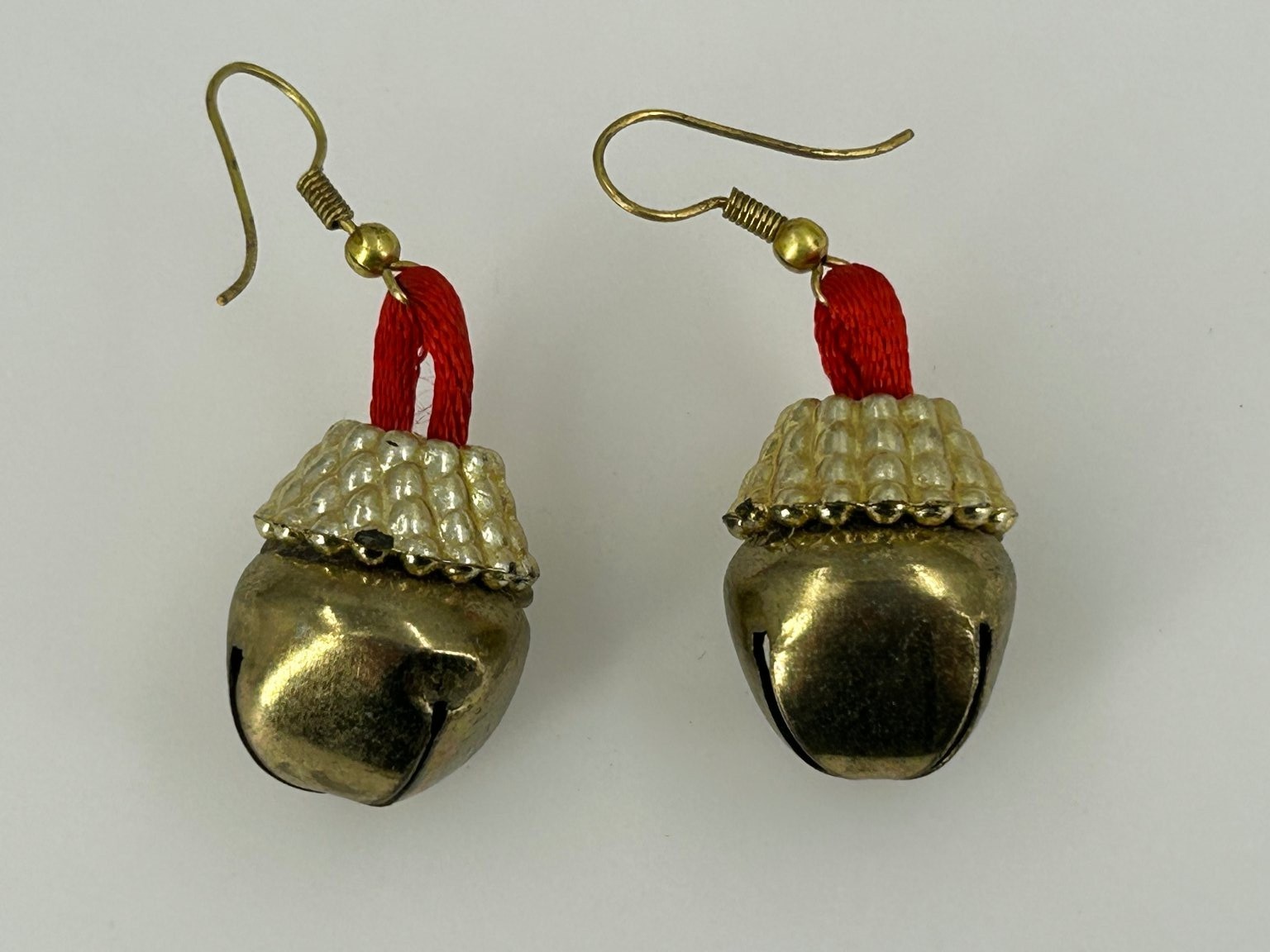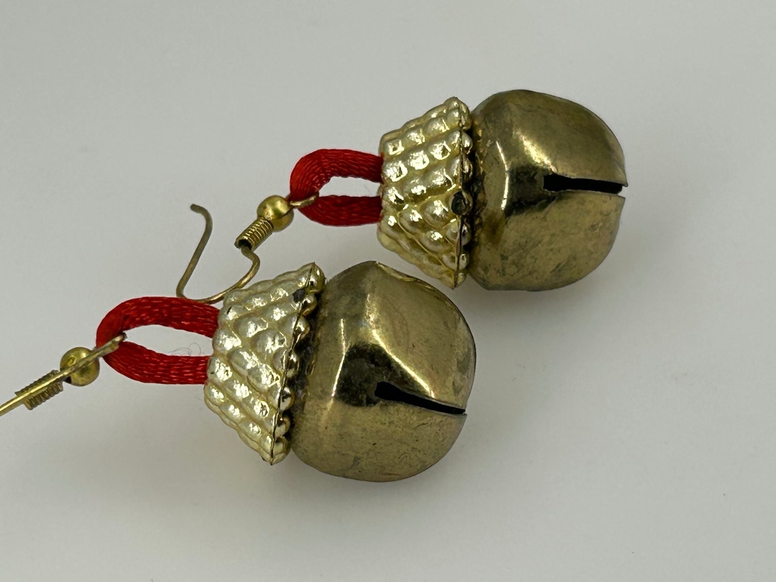 как выглядит Jingle Bell Dangle Earrings 1.75 Inch Drop Gold Tone with Red Ribbon Christmas фото