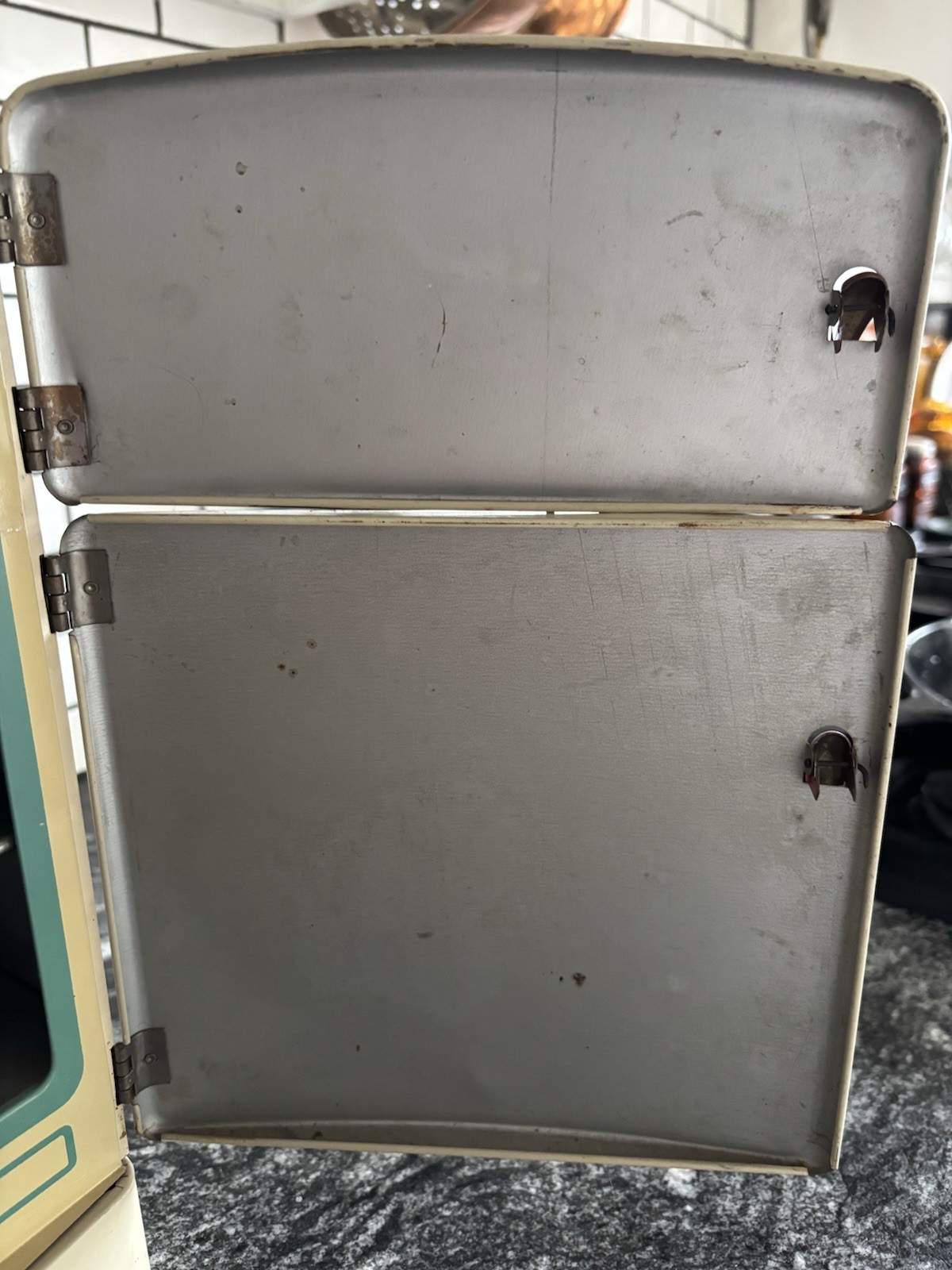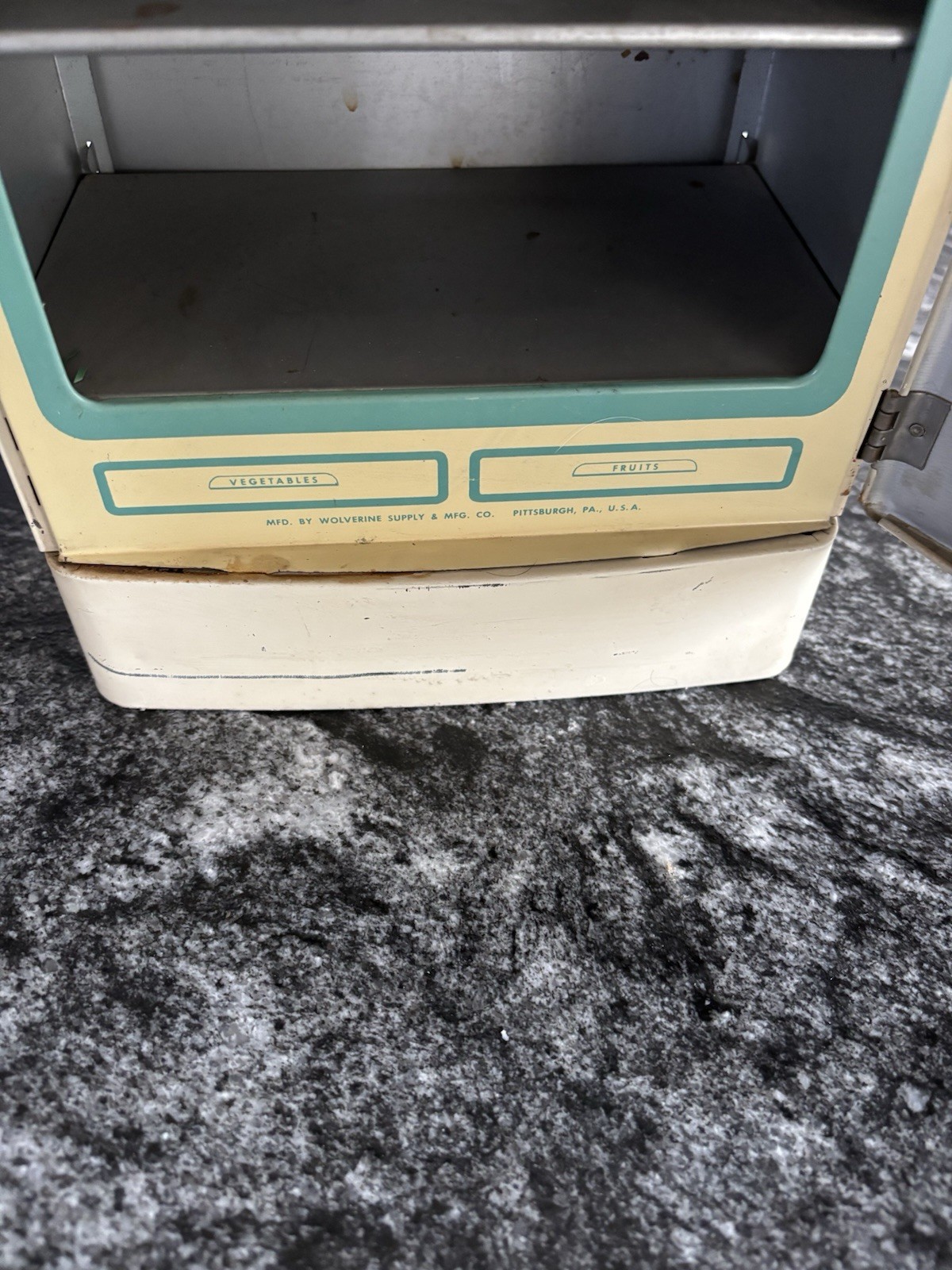 как выглядит Vtg 1950s Wolverine Supply Metal Tin Refrigerator Toy Kitchen - Pitts, PA фото