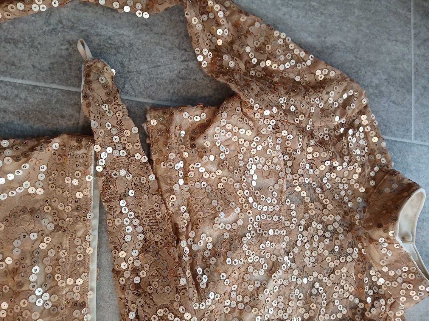 как выглядит Tenth House Dance Costume Crop Top Skirt Set Gold Sequin Long Sleeve Size PA фото